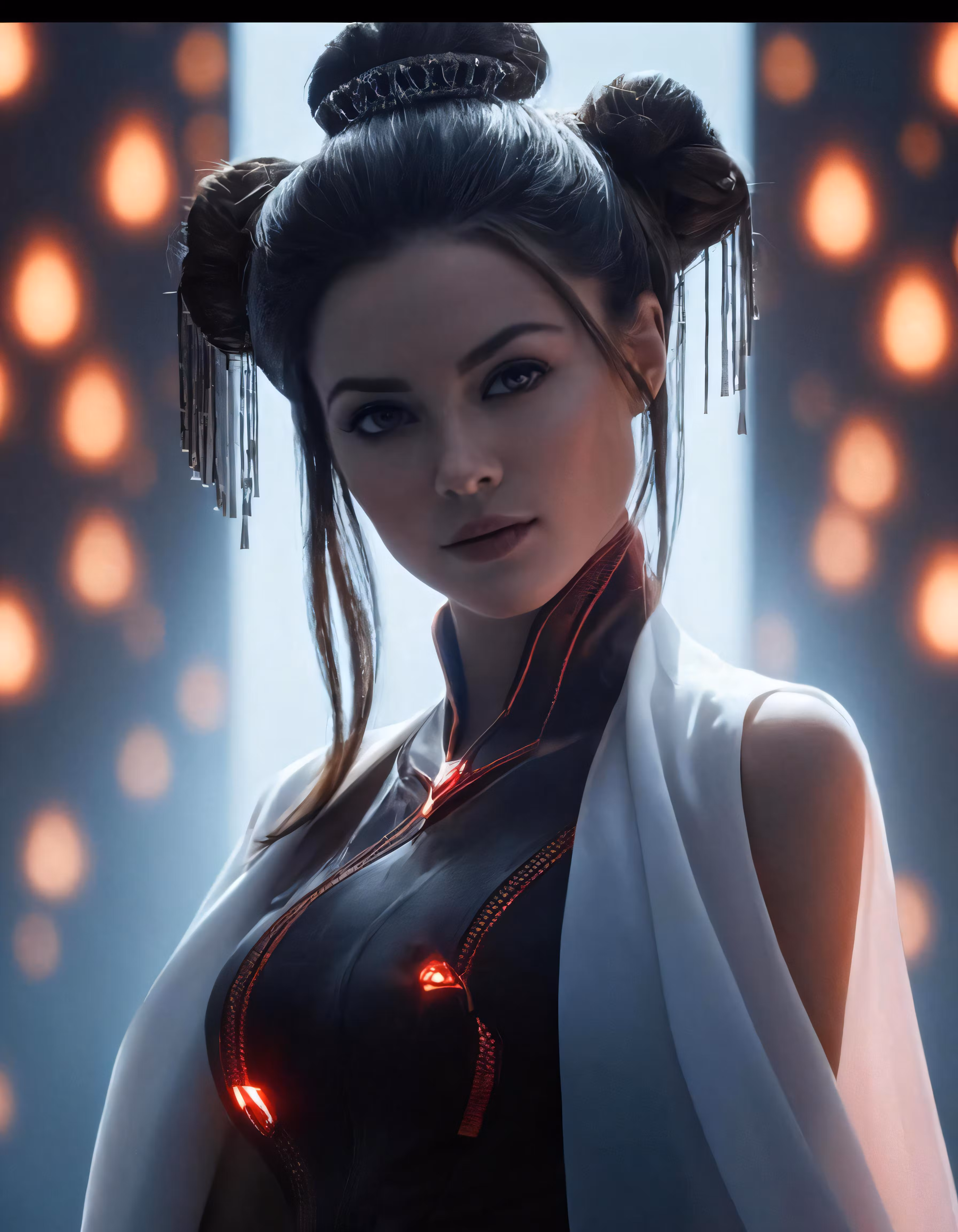 High resolution picture, free to use, a woman with a sci filament is wearing a necklace and a long robe