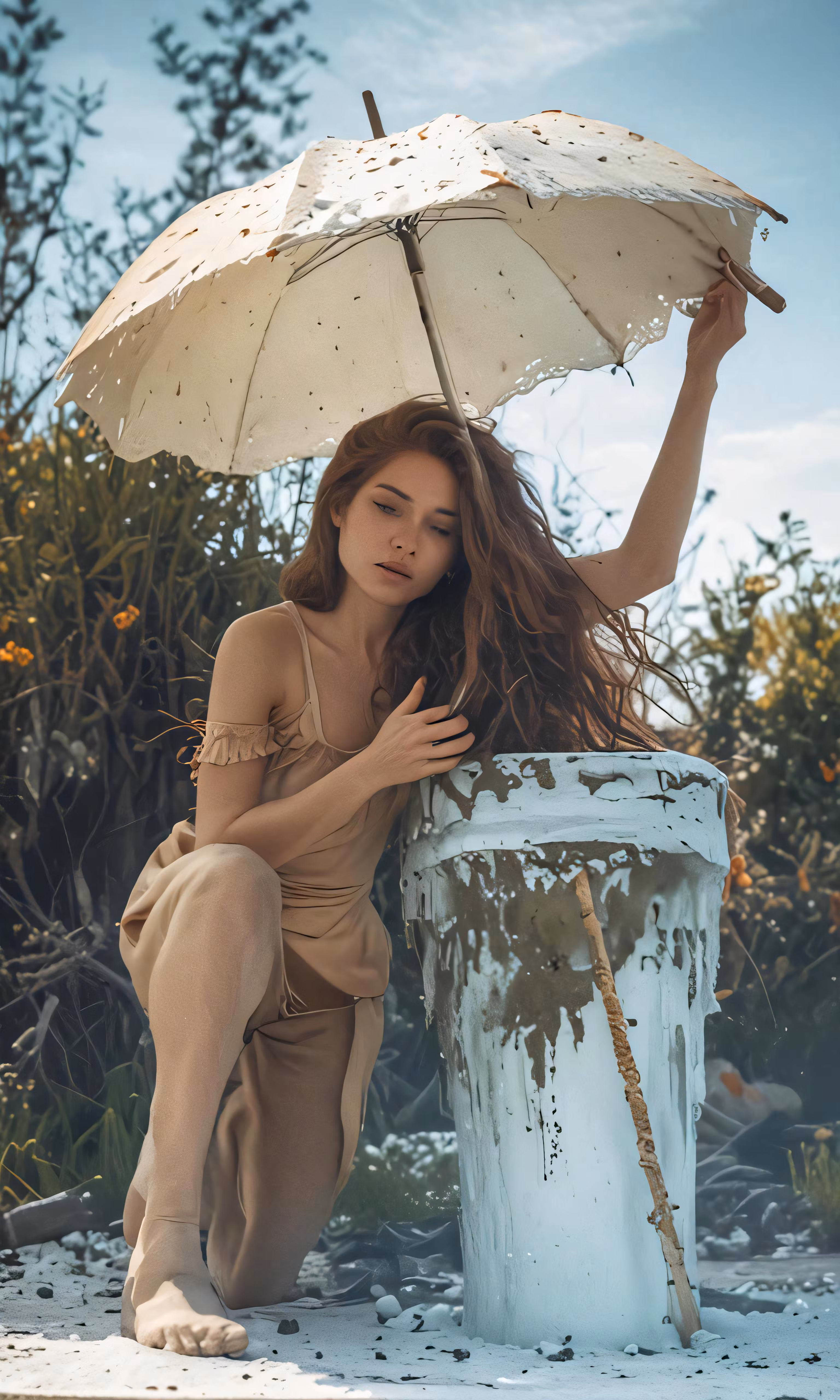 High resolution picture, free to use, a woman with a white umbrella leaning on a trash can