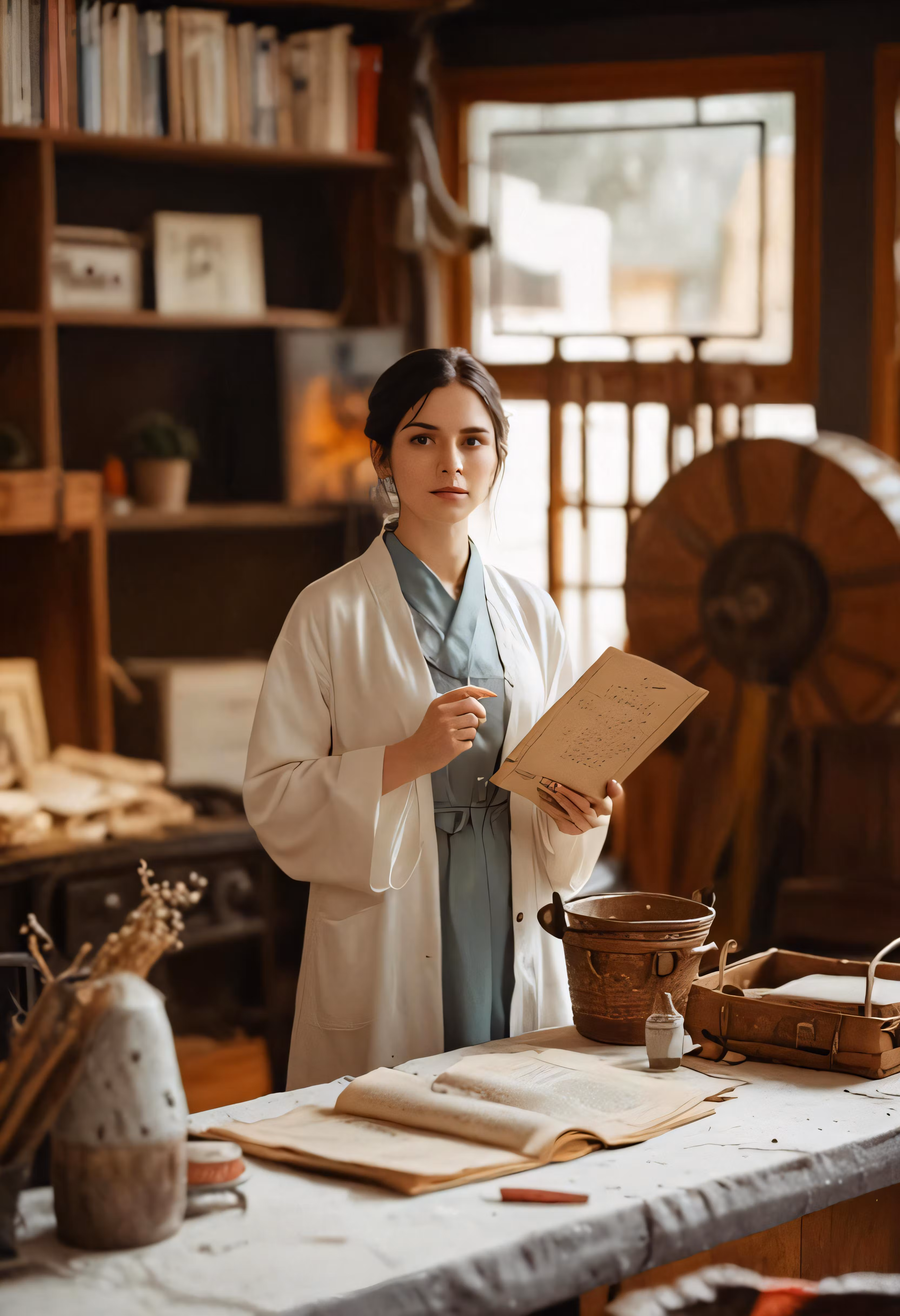 High resolution picture, free to use, a woman with an ancient writing device stands by a wooden table
