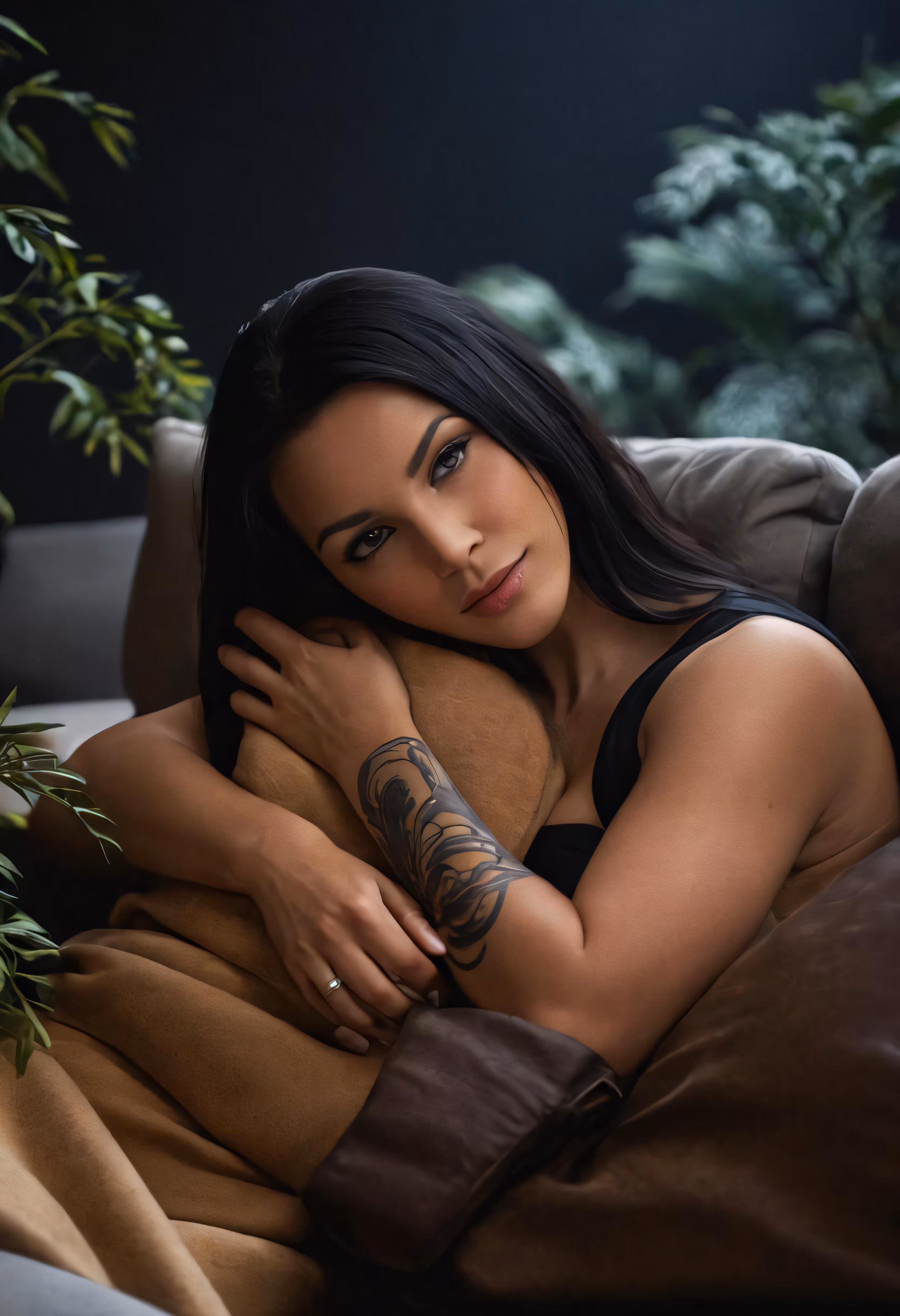 High resolution picture, free to use, a woman with black hair sits on a brown couch, leaning on her arm