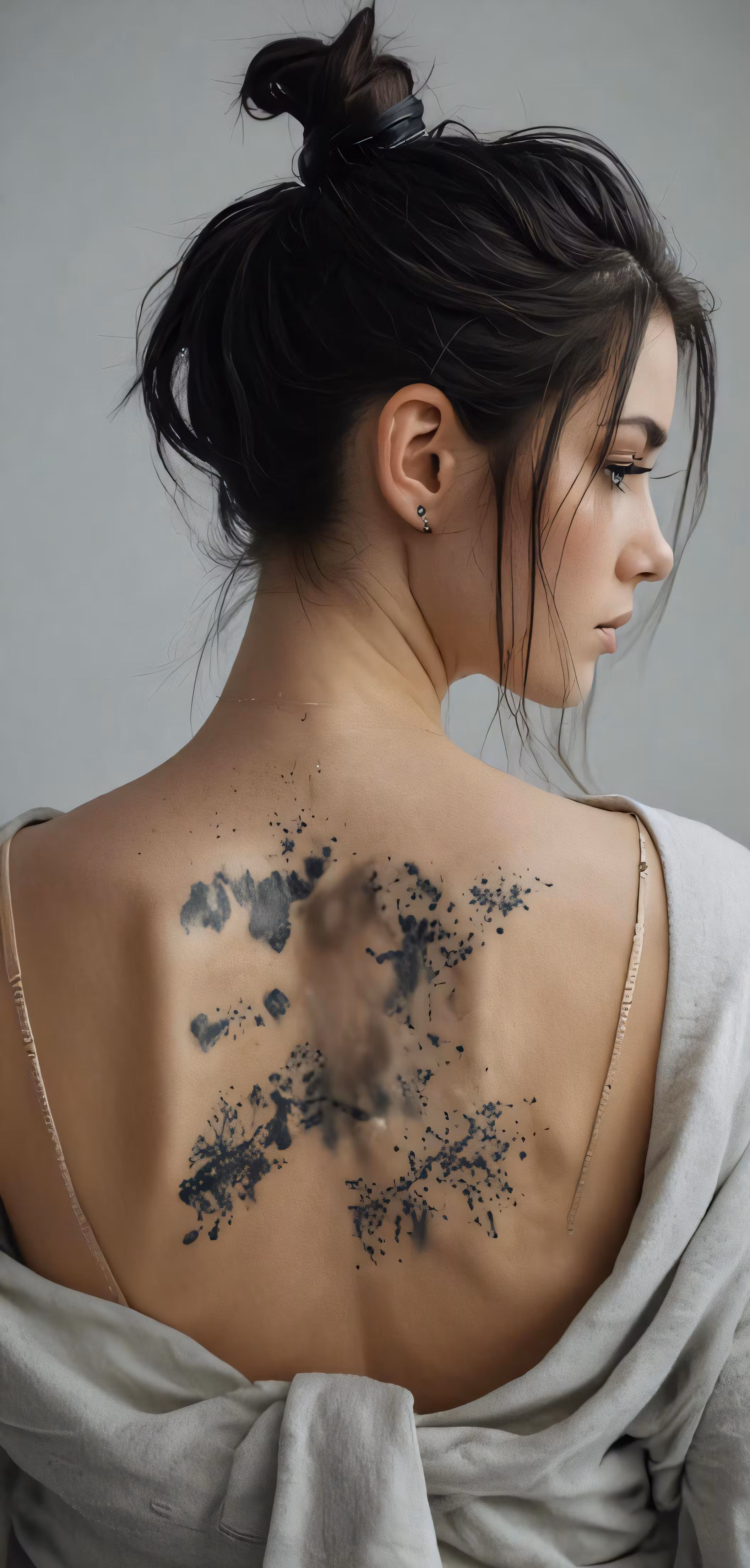High resolution picture, free to use, a woman with black ink on her back in a white cloth