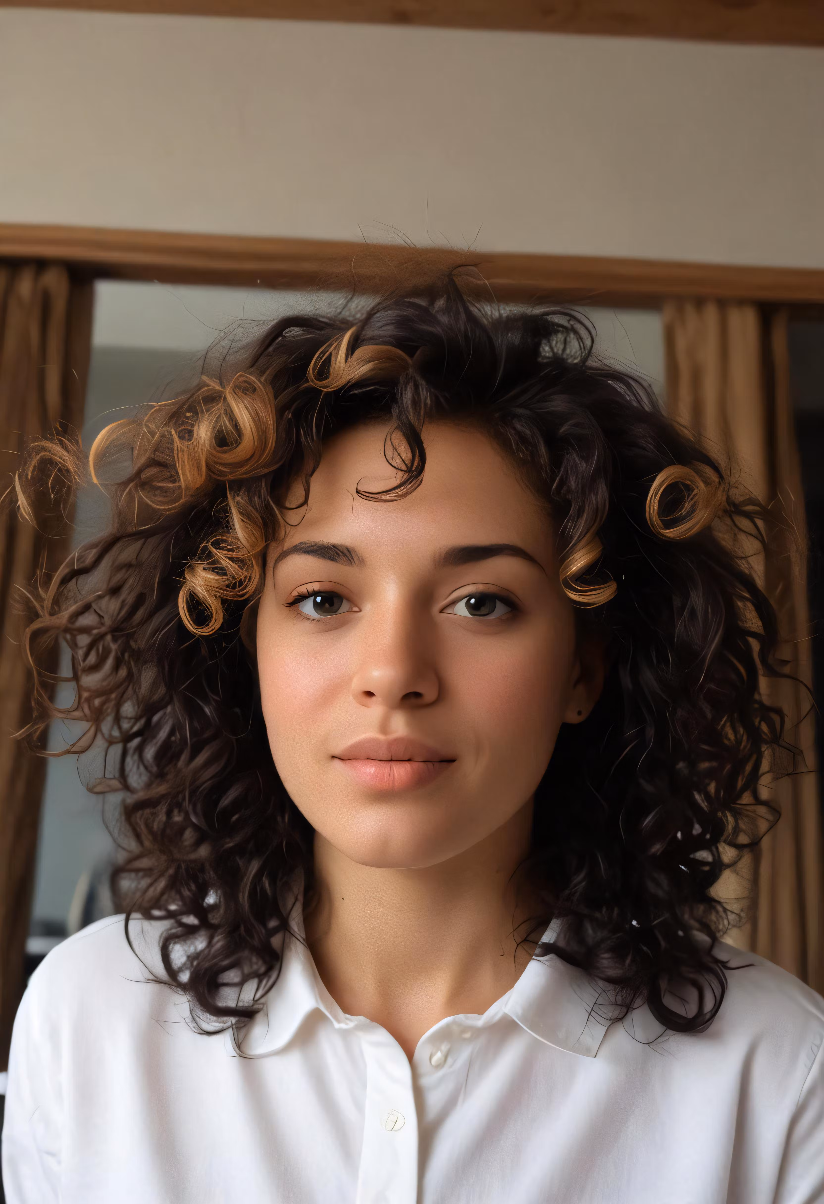 High resolution picture, free to use, a woman with curly hair looking into the camera