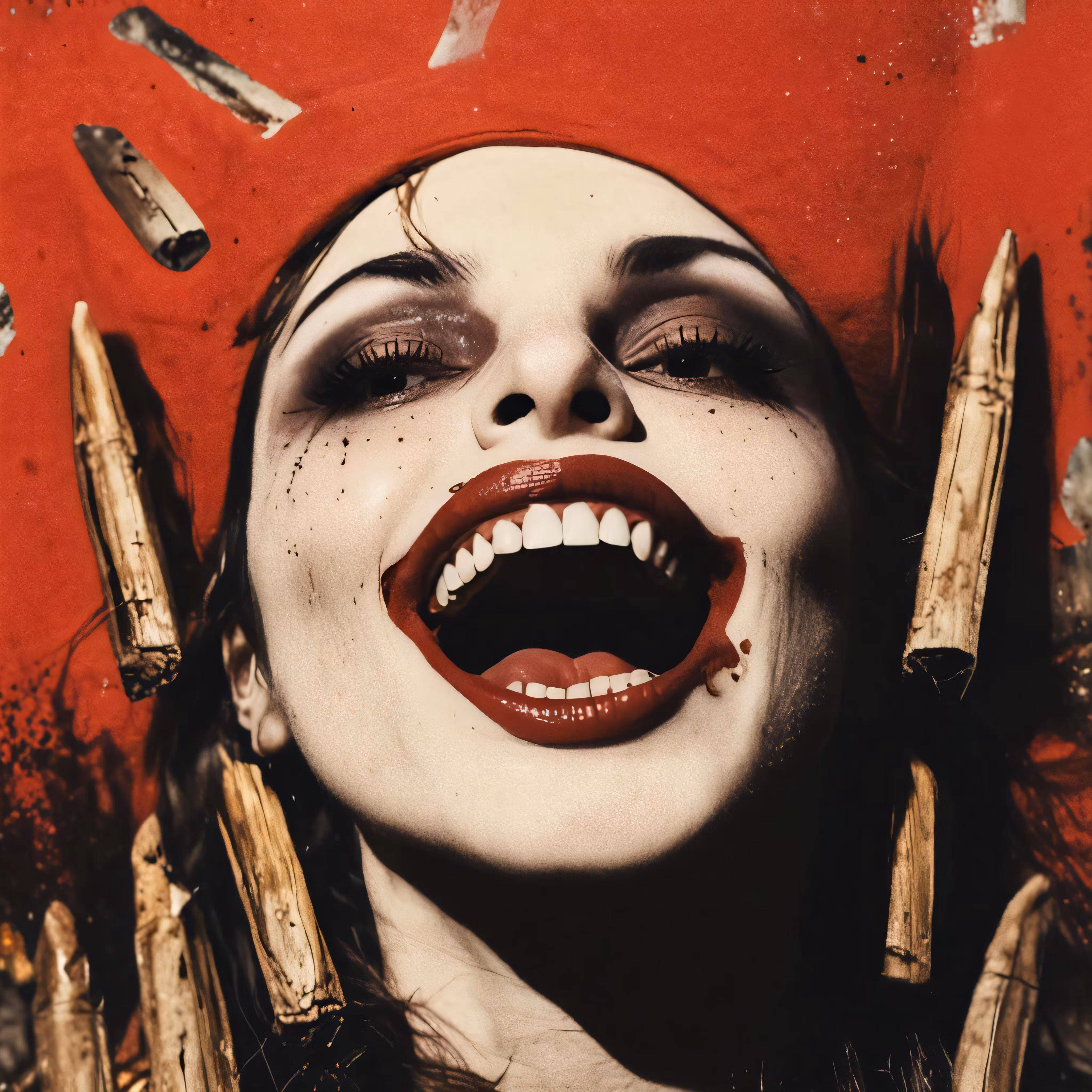 High resolution picture, free to use, a woman with fake blood all over her face and holding weapons