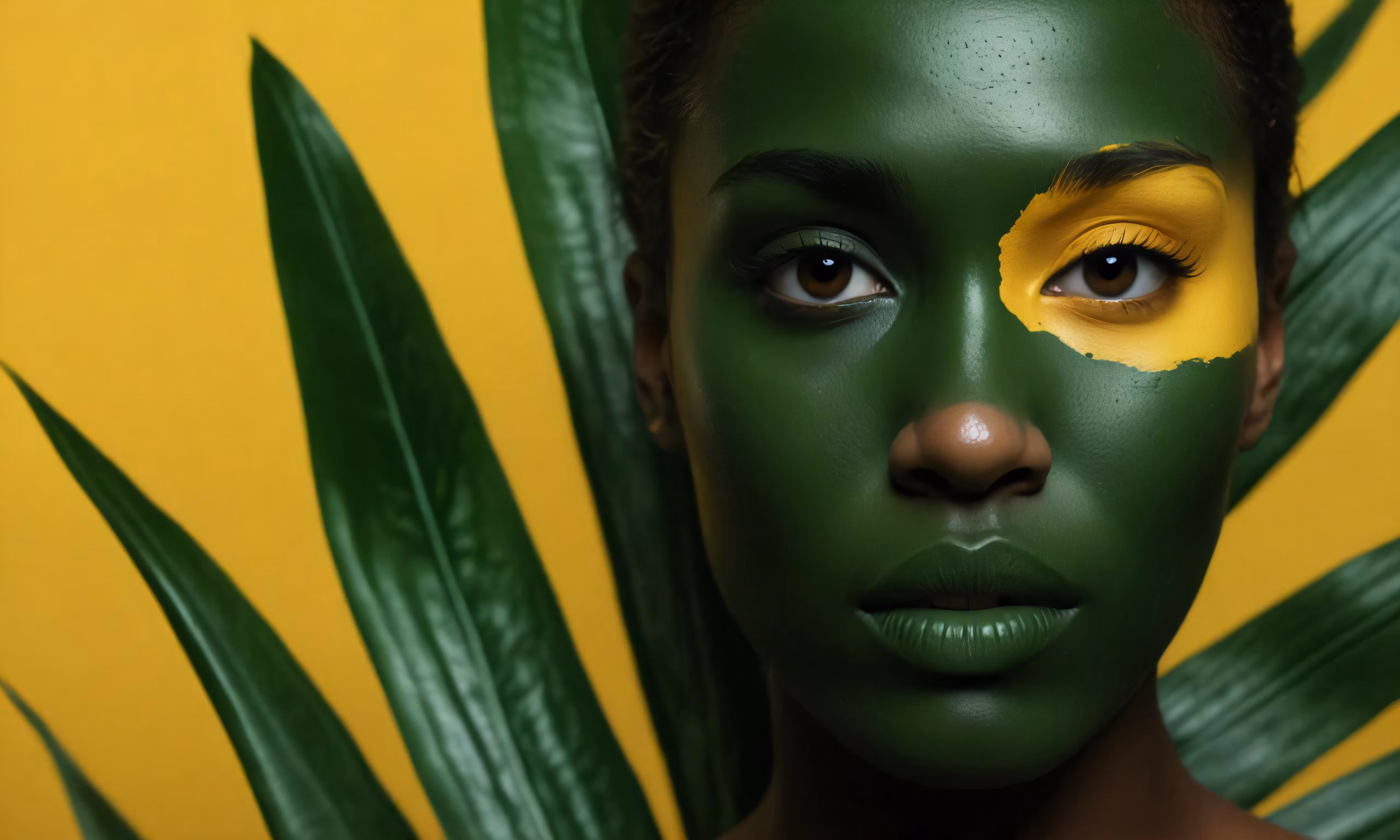 High resolution picture, free to use, a woman with green and yellow painted on her face