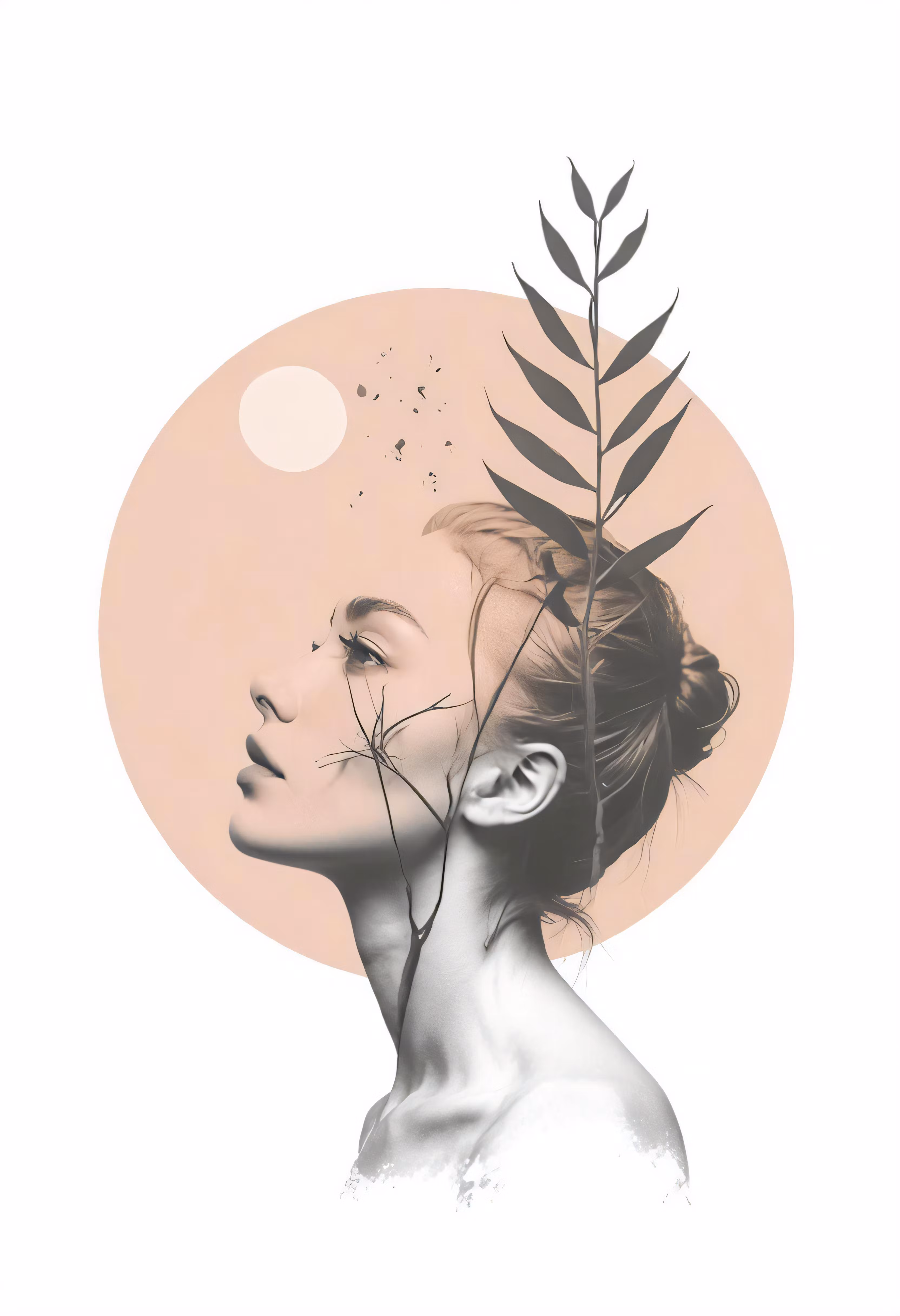 High resolution picture, free to use, a woman with leaves on her head and a sun behind her