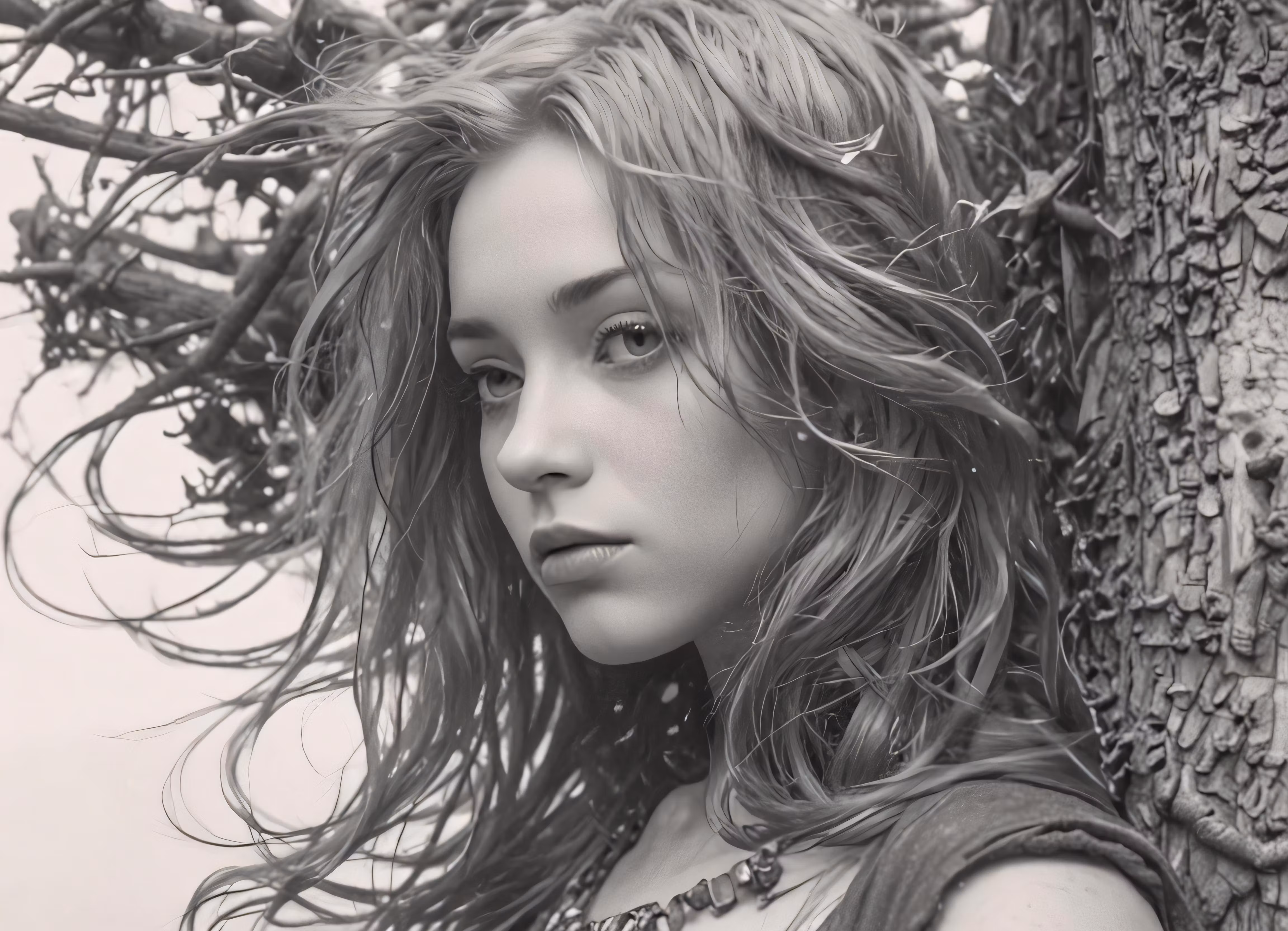 High resolution picture, free to use, a woman with long blonde hair standing next to a tree