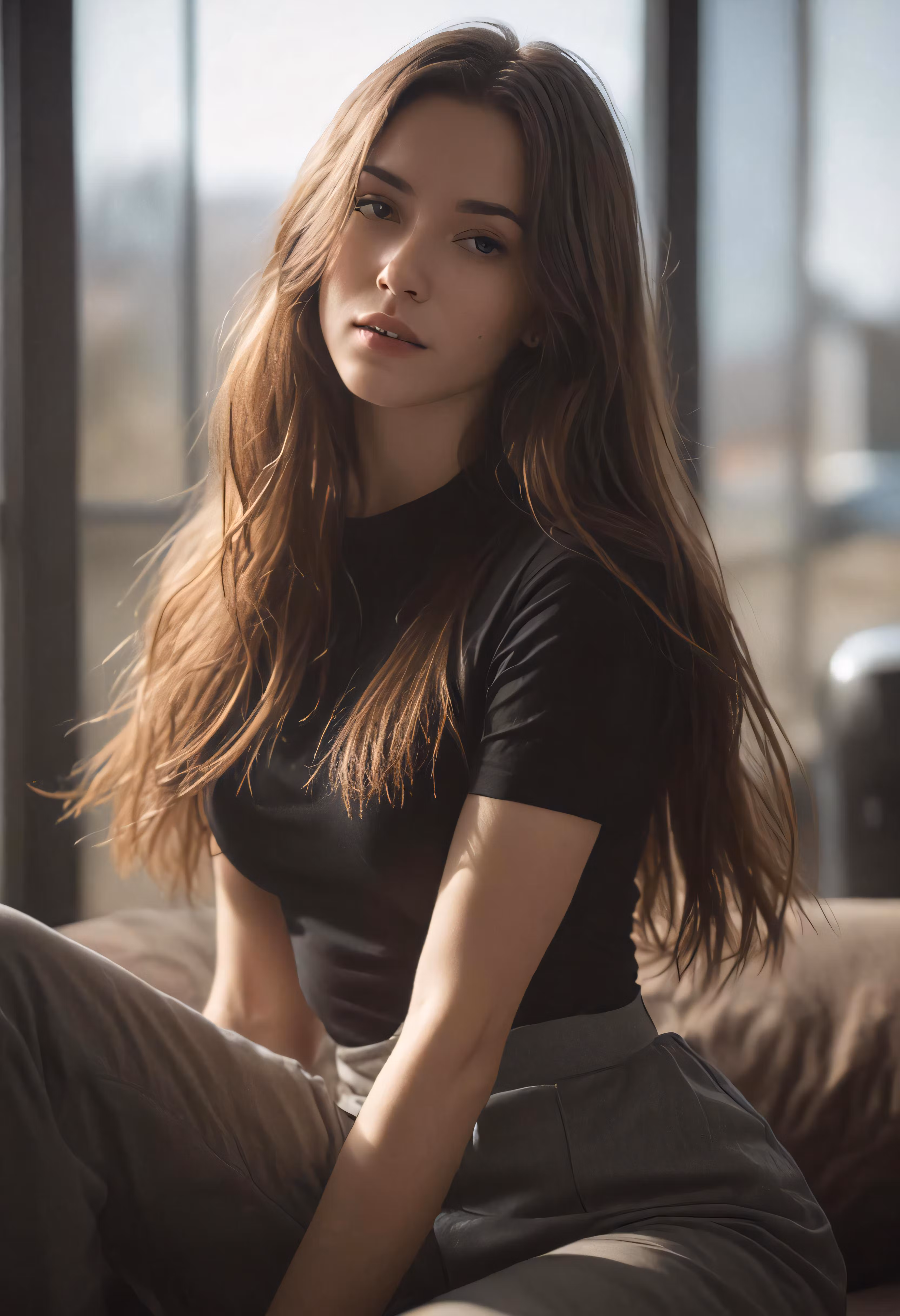 High resolution picture, free to use, a woman with long hair is sitting on a couch