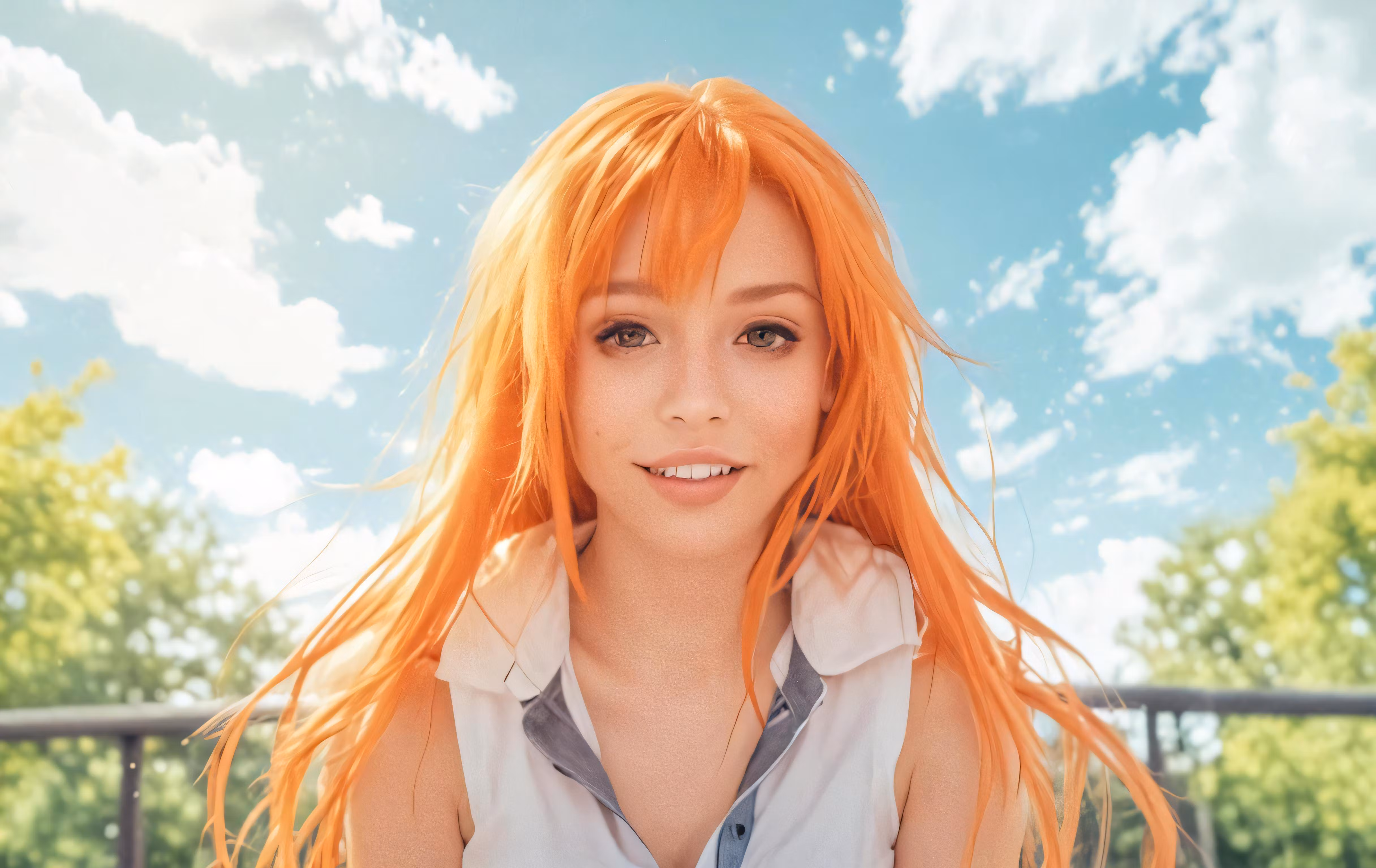 High resolution picture, free to use, a woman with long orange hair with her shirt undone