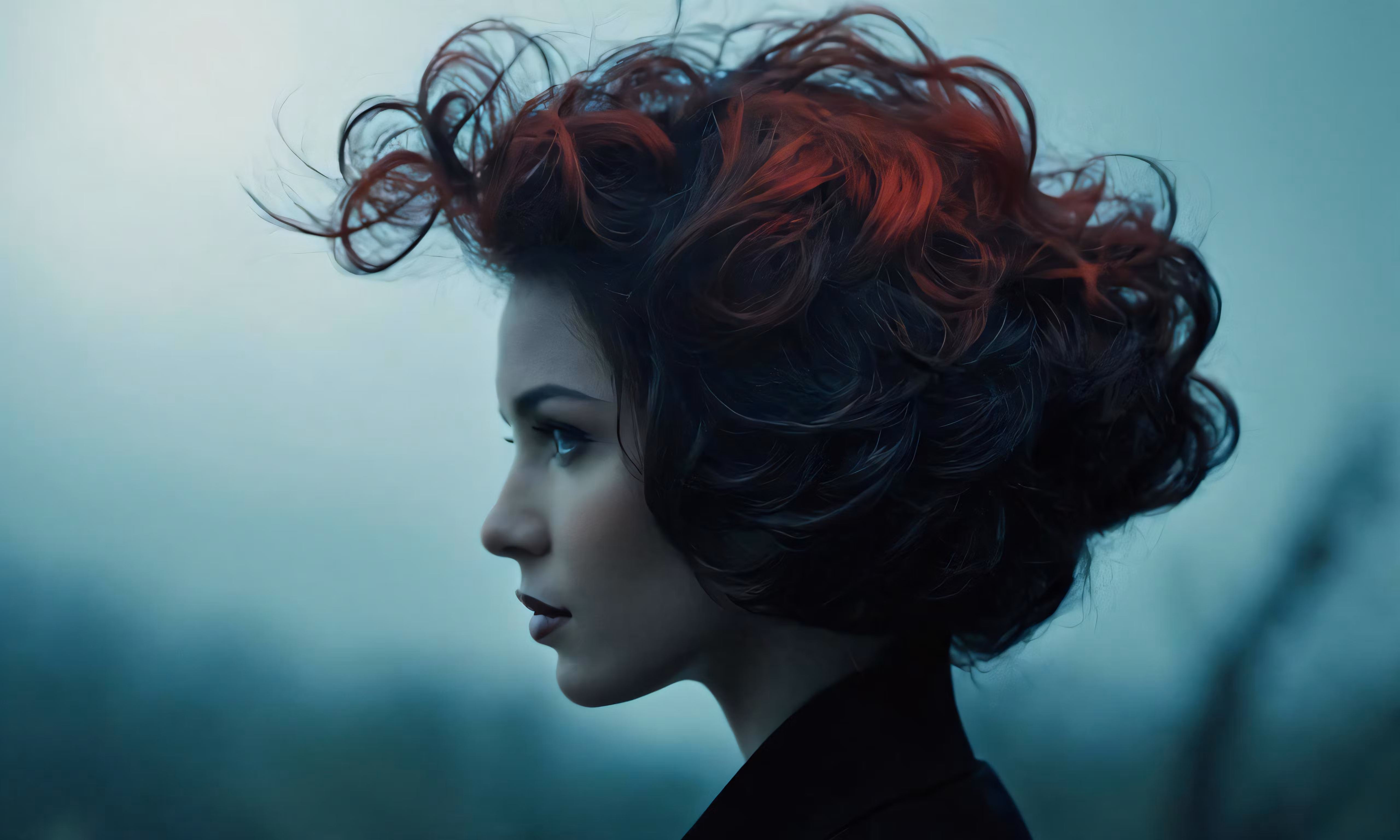 High resolution picture, free to use, a woman with red hair, black dress and red and white floral bouquet