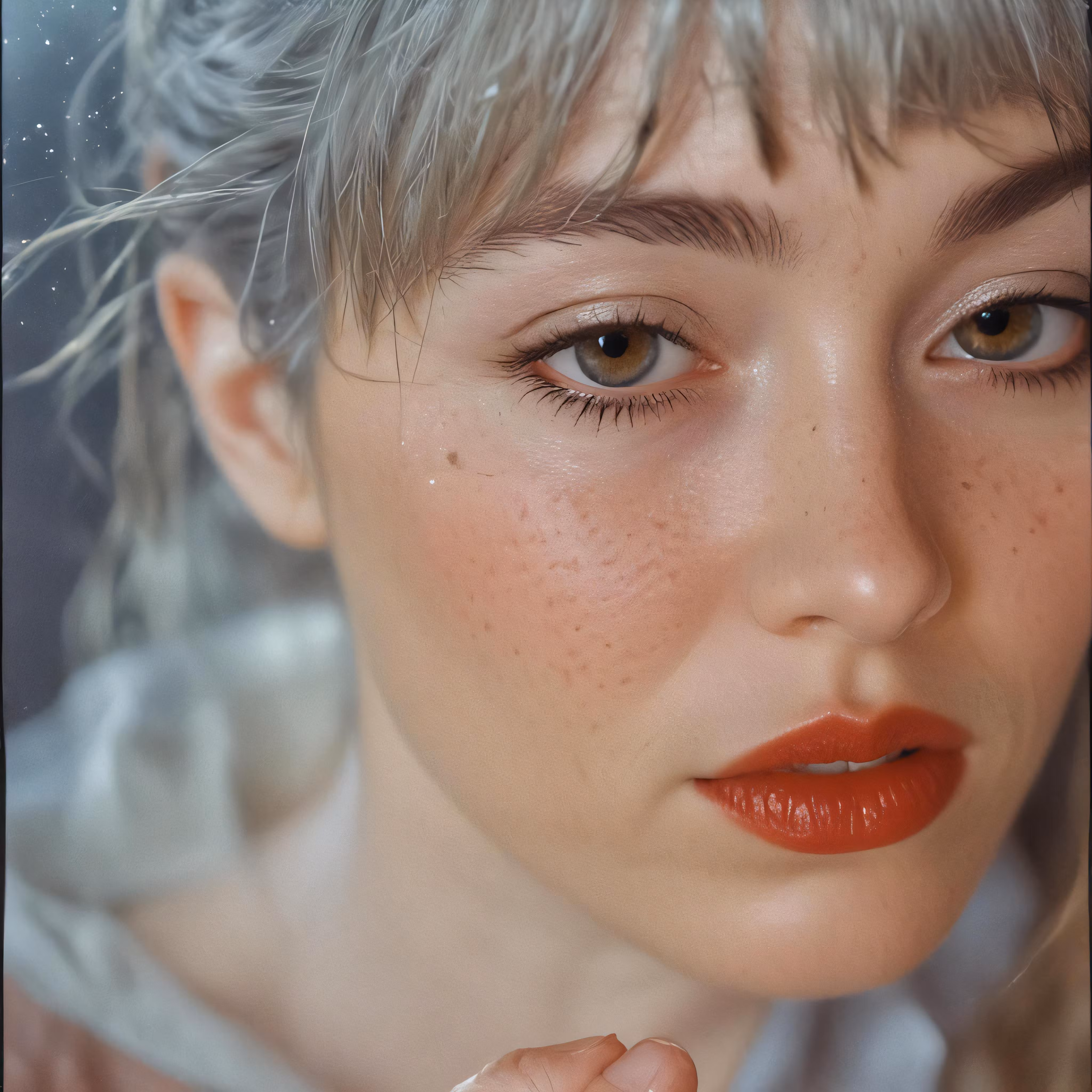 High resolution picture, free to use, a woman with short hair and orange lipstick
