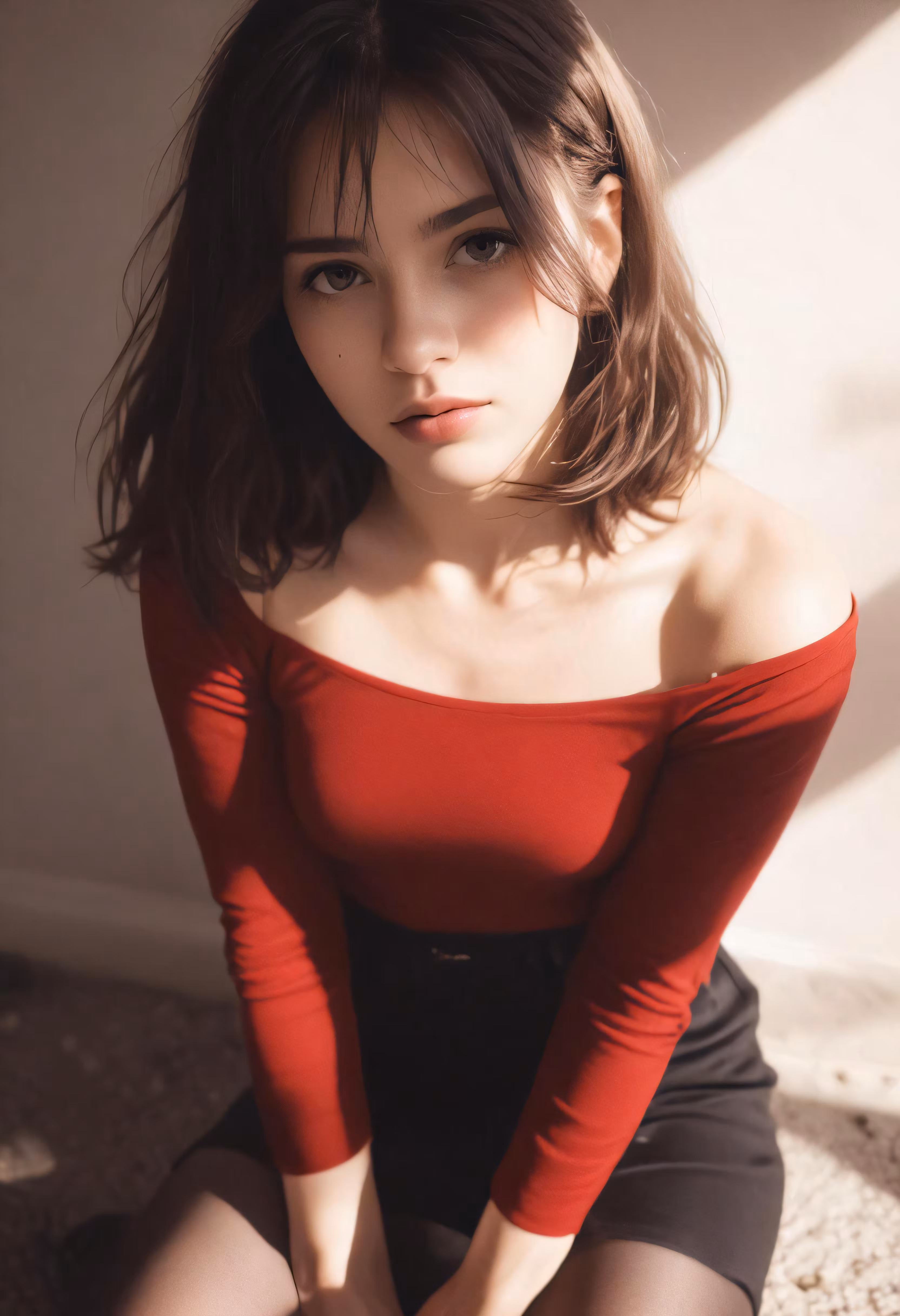 High resolution picture, free to use, a woman with short legs wearing a red shirt