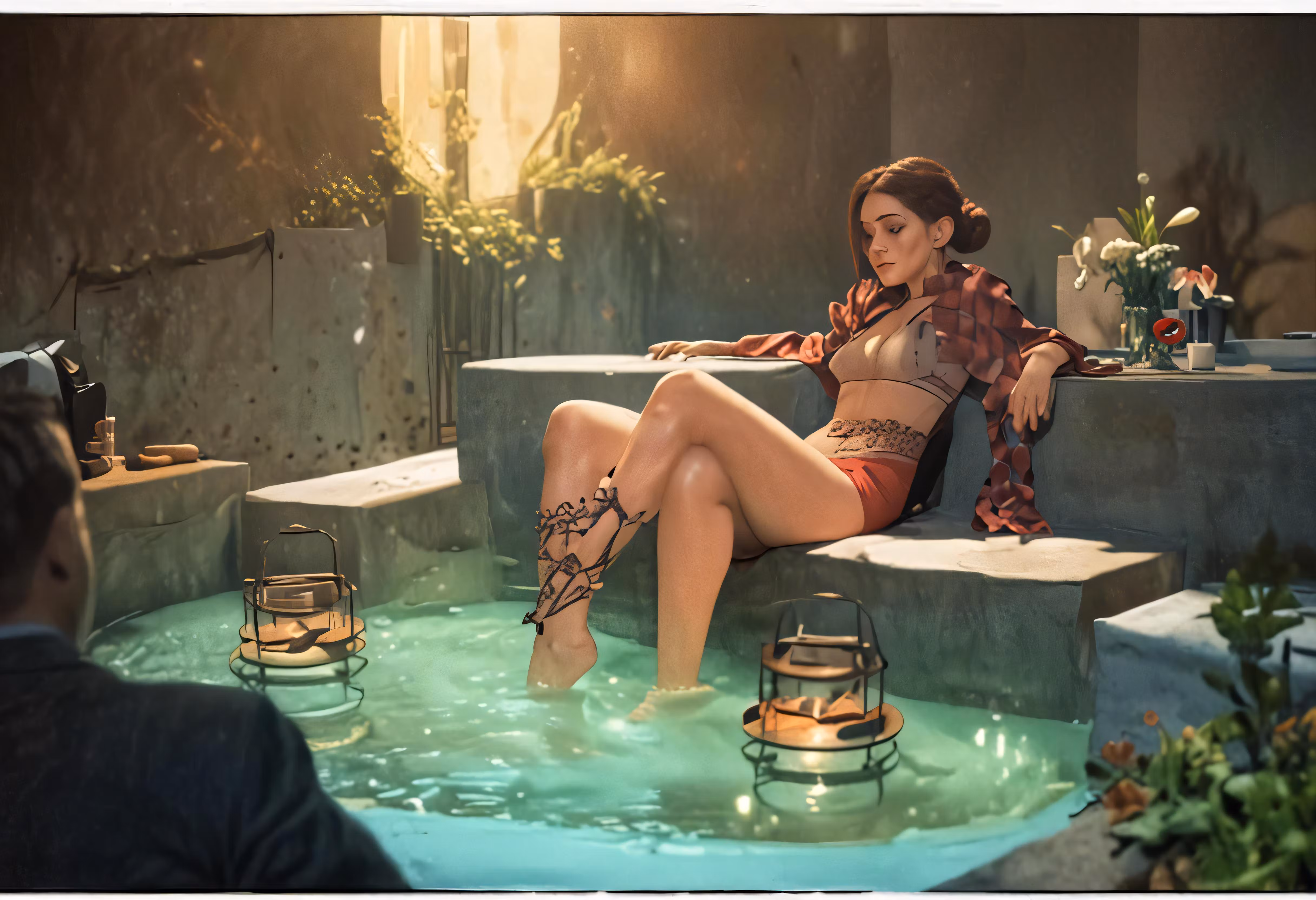 High resolution picture, free to use, a women sitting on steps inside of a hot tub