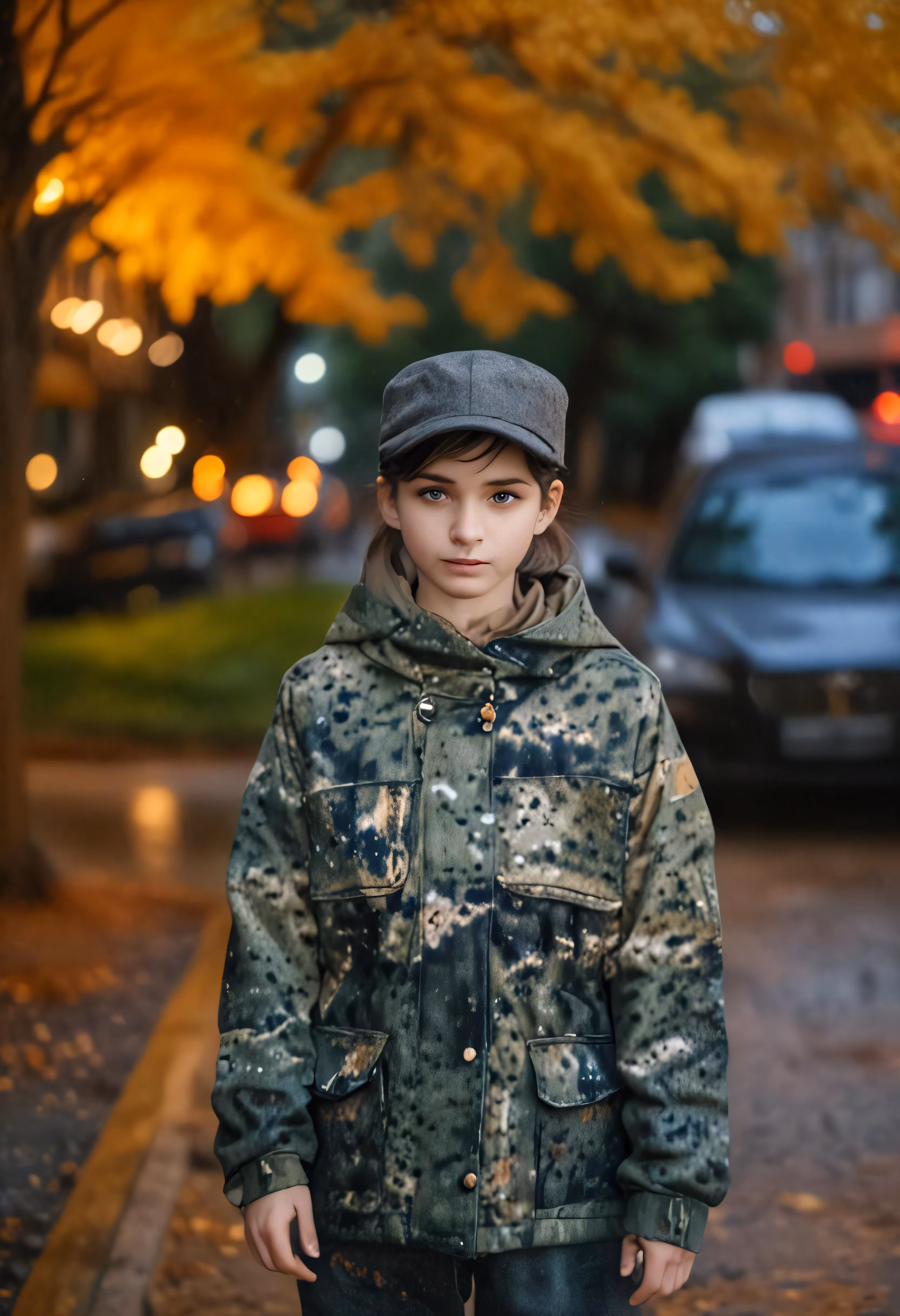 High resolution picture, free to use, a young boy stands on a street corner wearing an army jacket