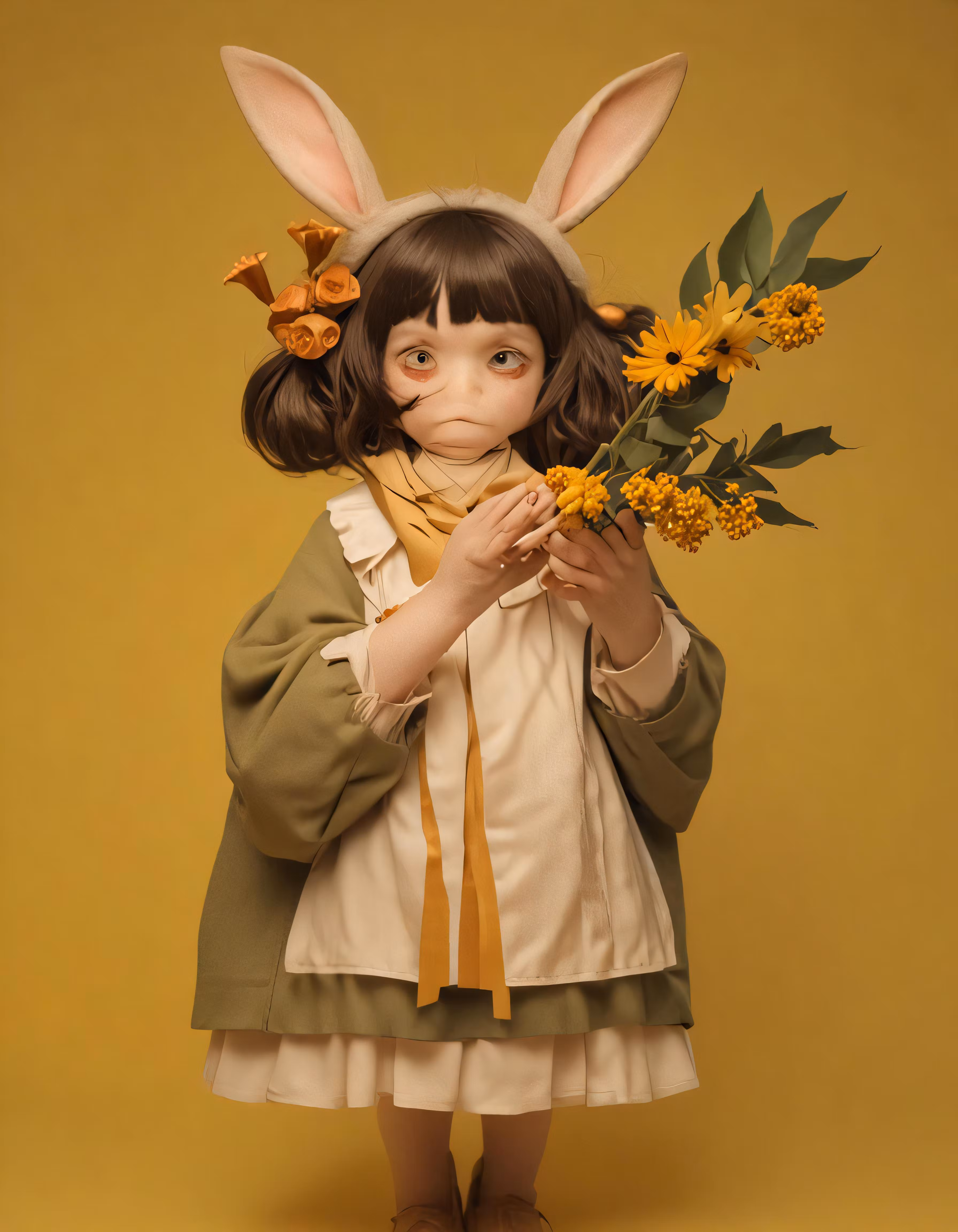 High resolution picture, free to use, a young child in a bunny suit is holding a bunch of flowers