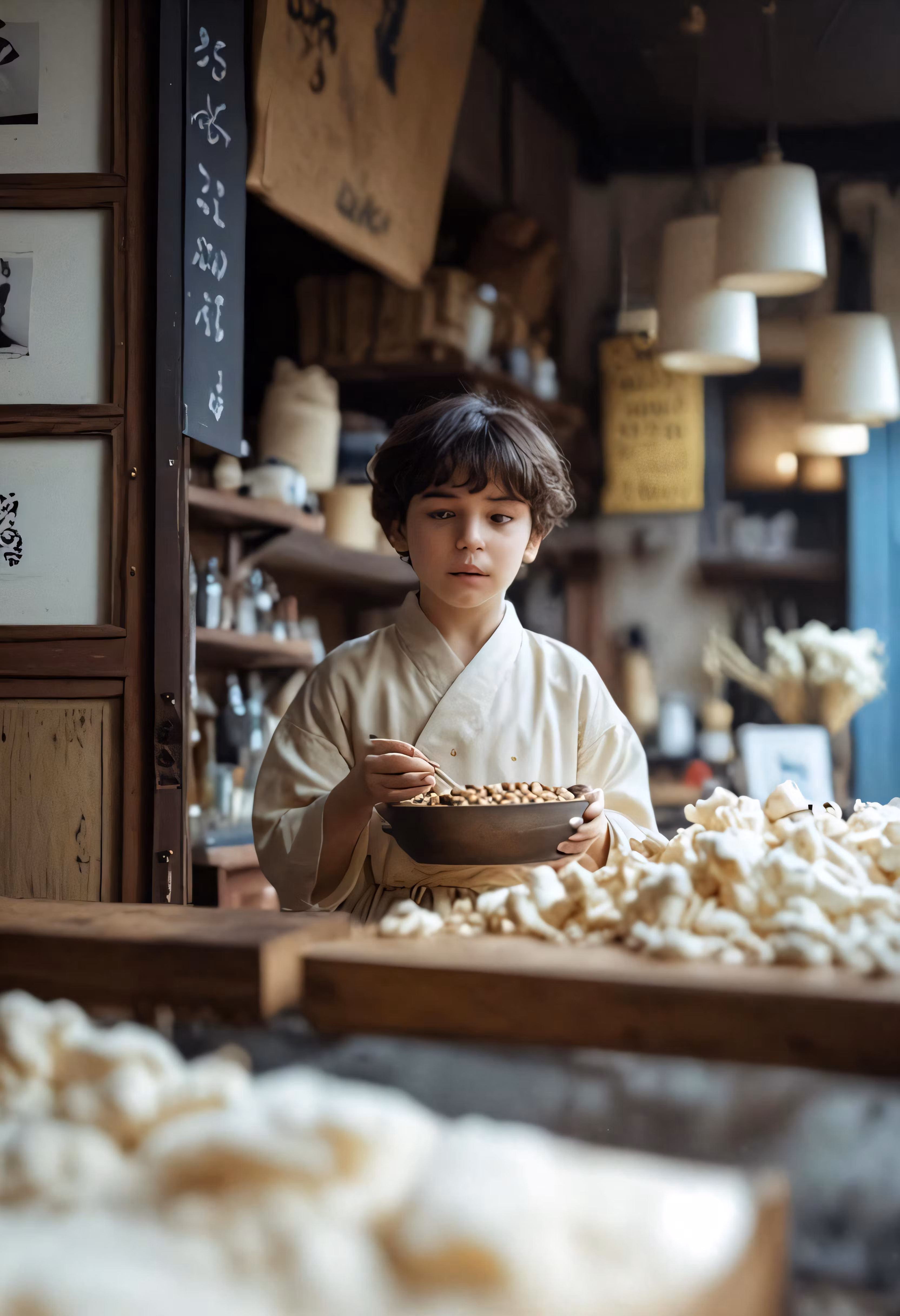 High resolution picture, free to use, a young child standing behind a bowl of food