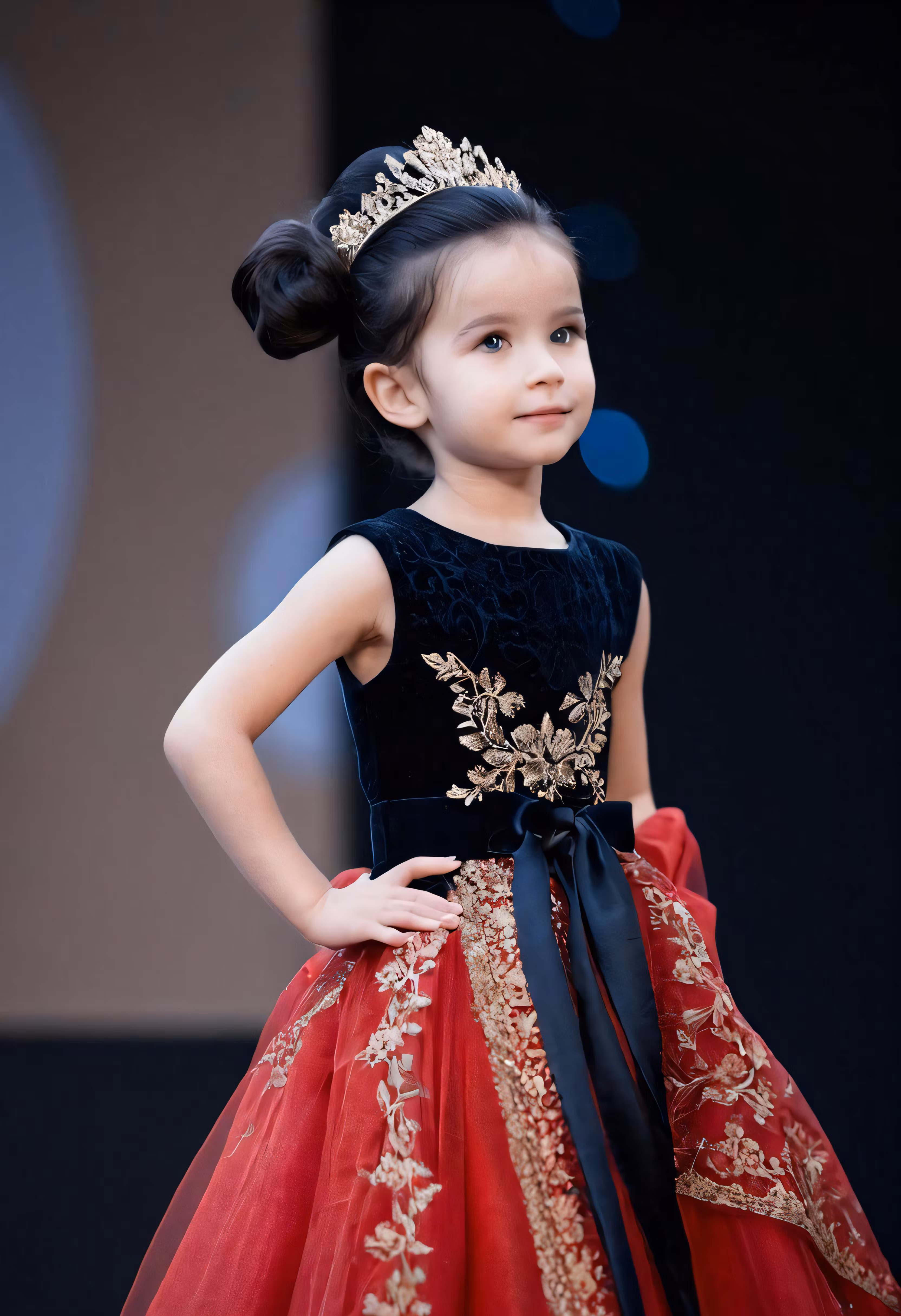 High resolution picture, free to use, a young girl dressed in a red and black dress with gold accents