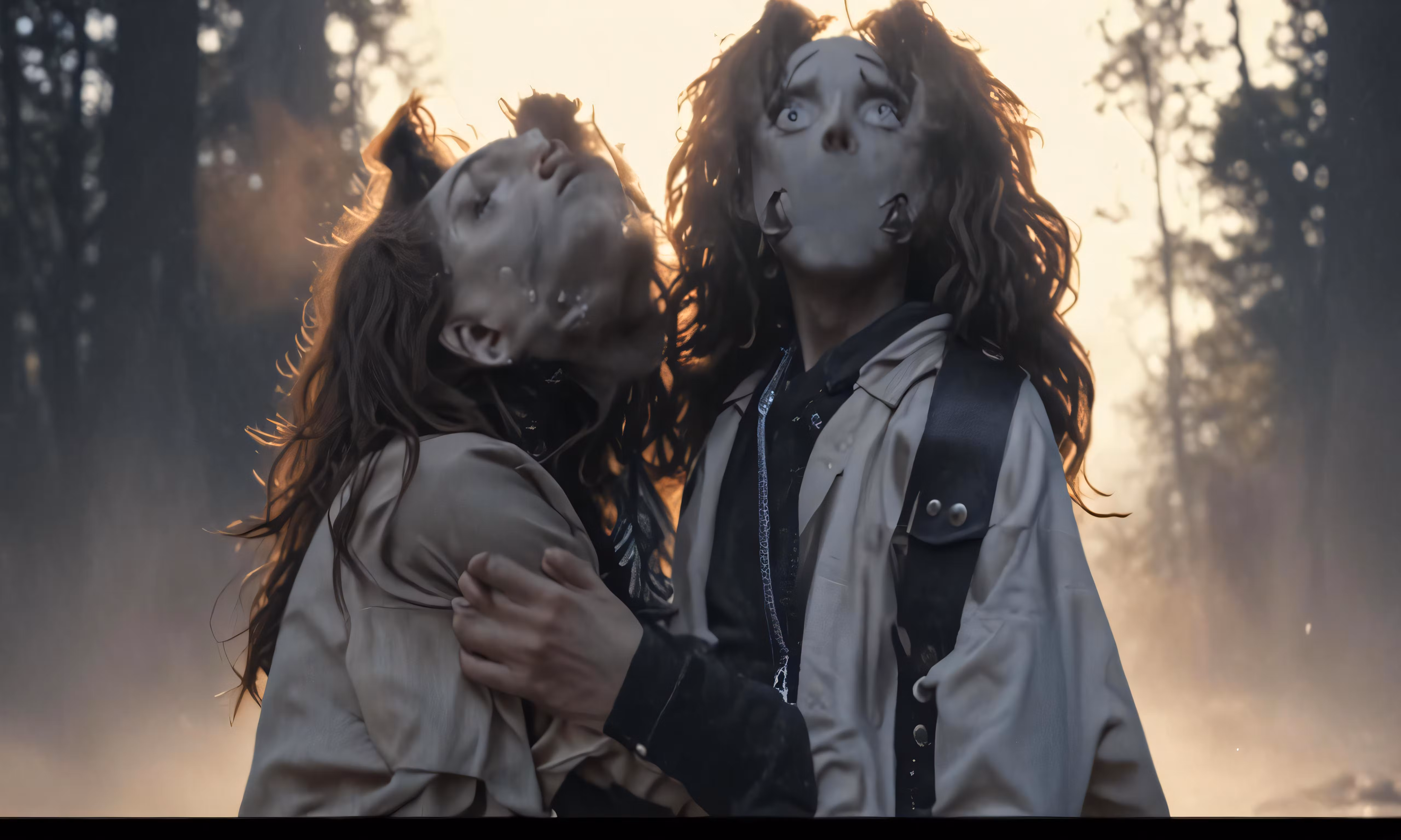 High resolution picture, free to use, a young girl is hugging an adult with her head painted like the person from friday the 13th