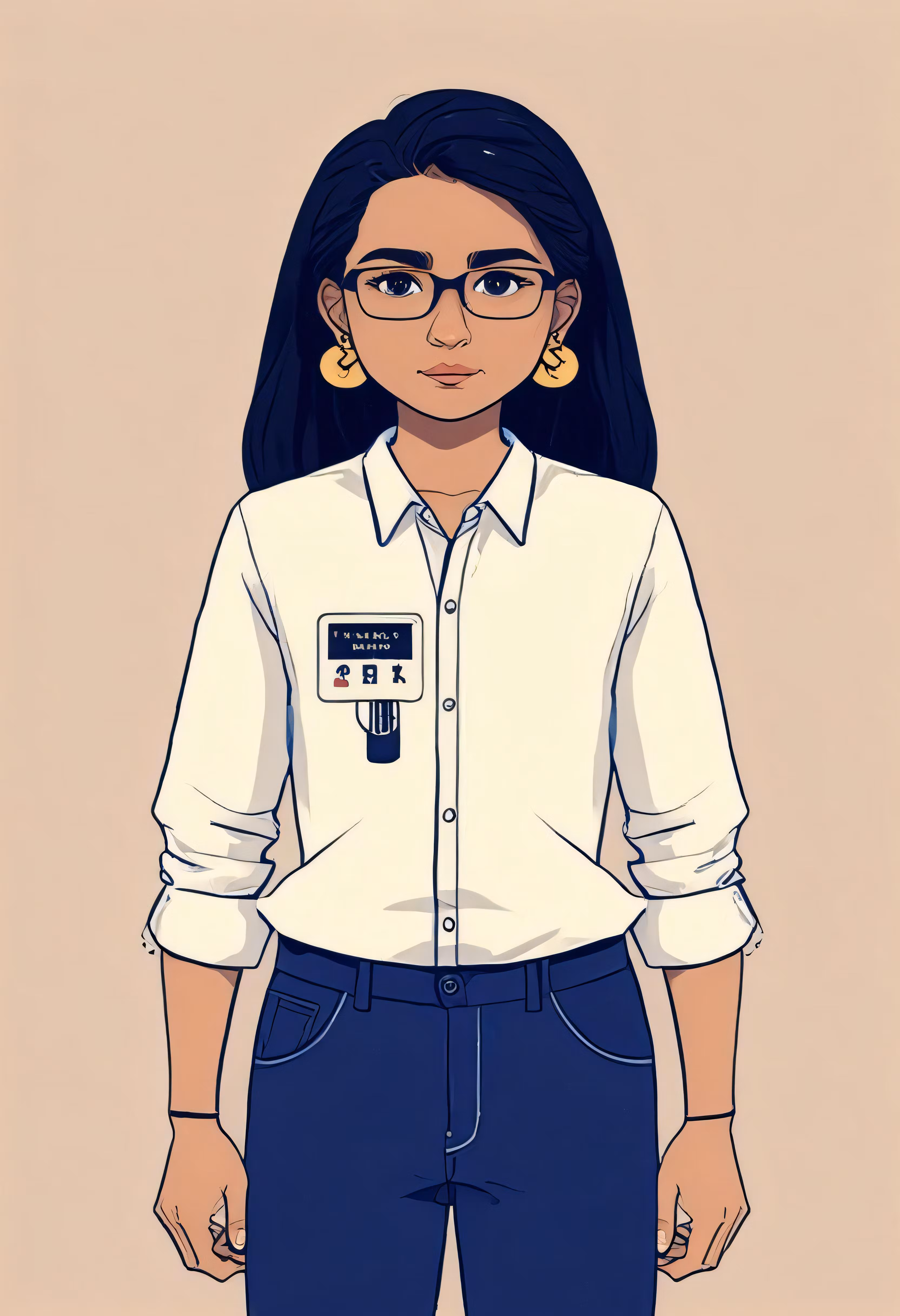 High resolution picture, free to use, a young girl with glasses is wearing a white shirt and blue pants