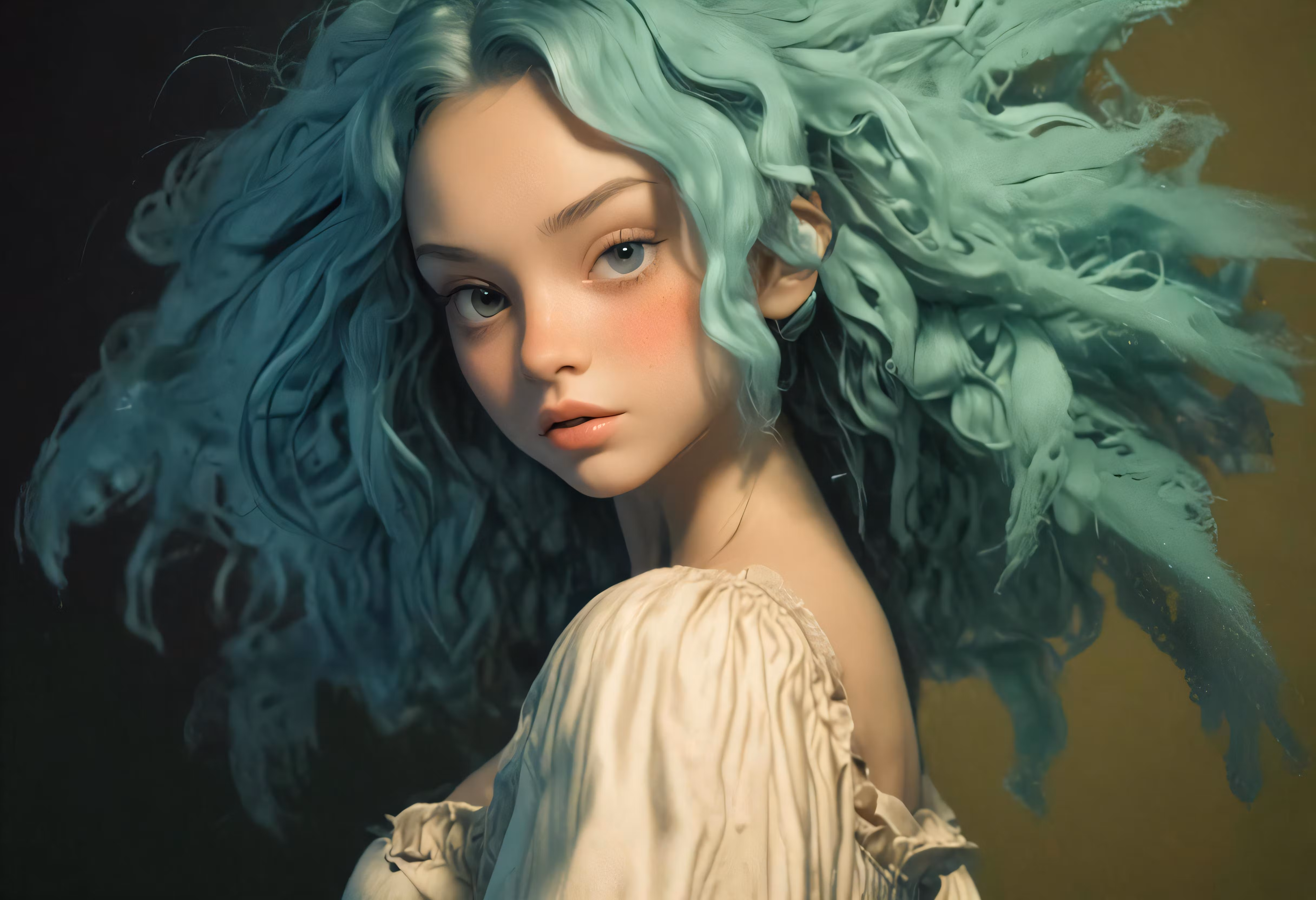 High resolution picture, free to use, a young girl with light green hair and blue eyes