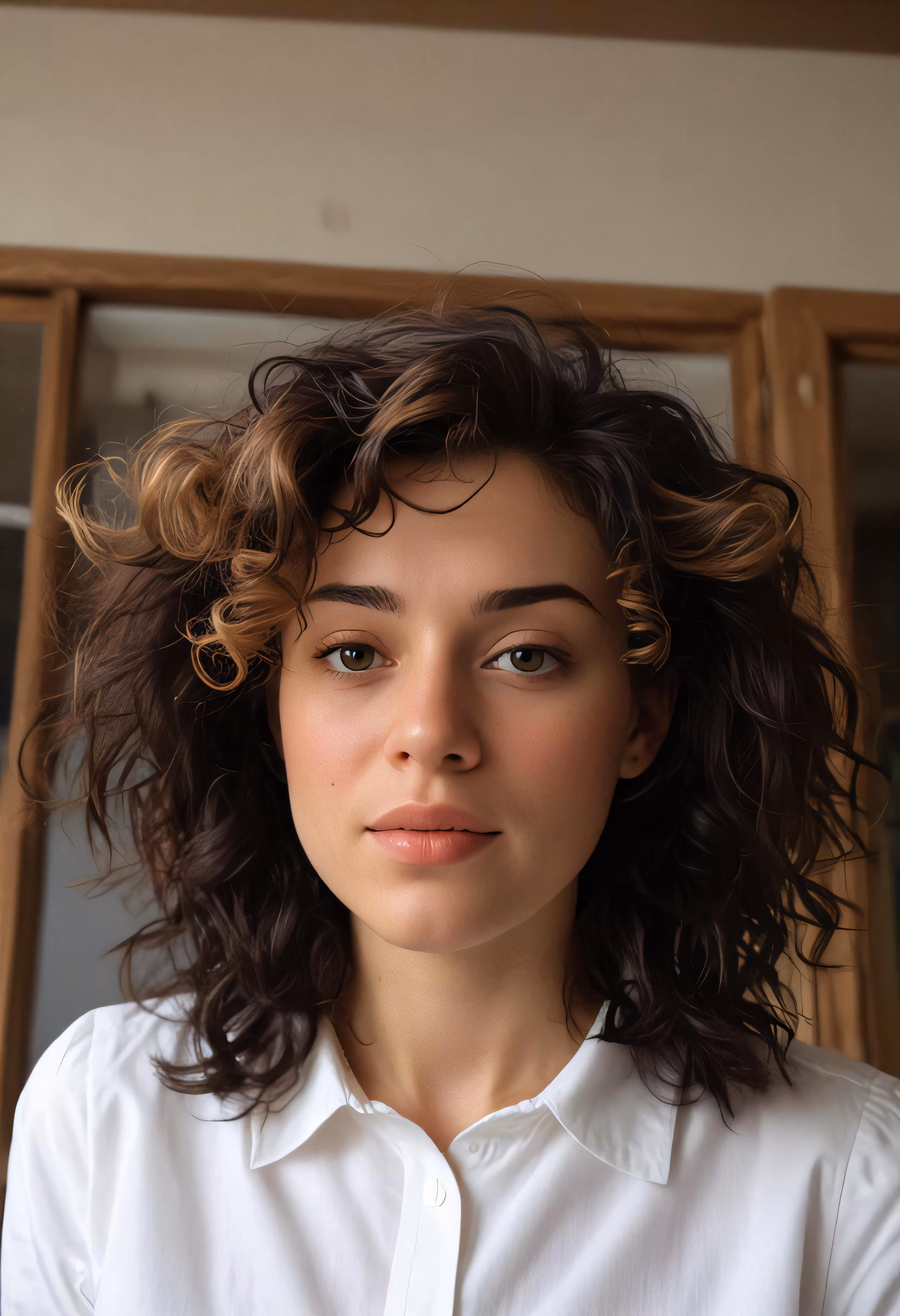 High resolution picture, free to use, a young lady wearing a white blouse with curly brown hair
