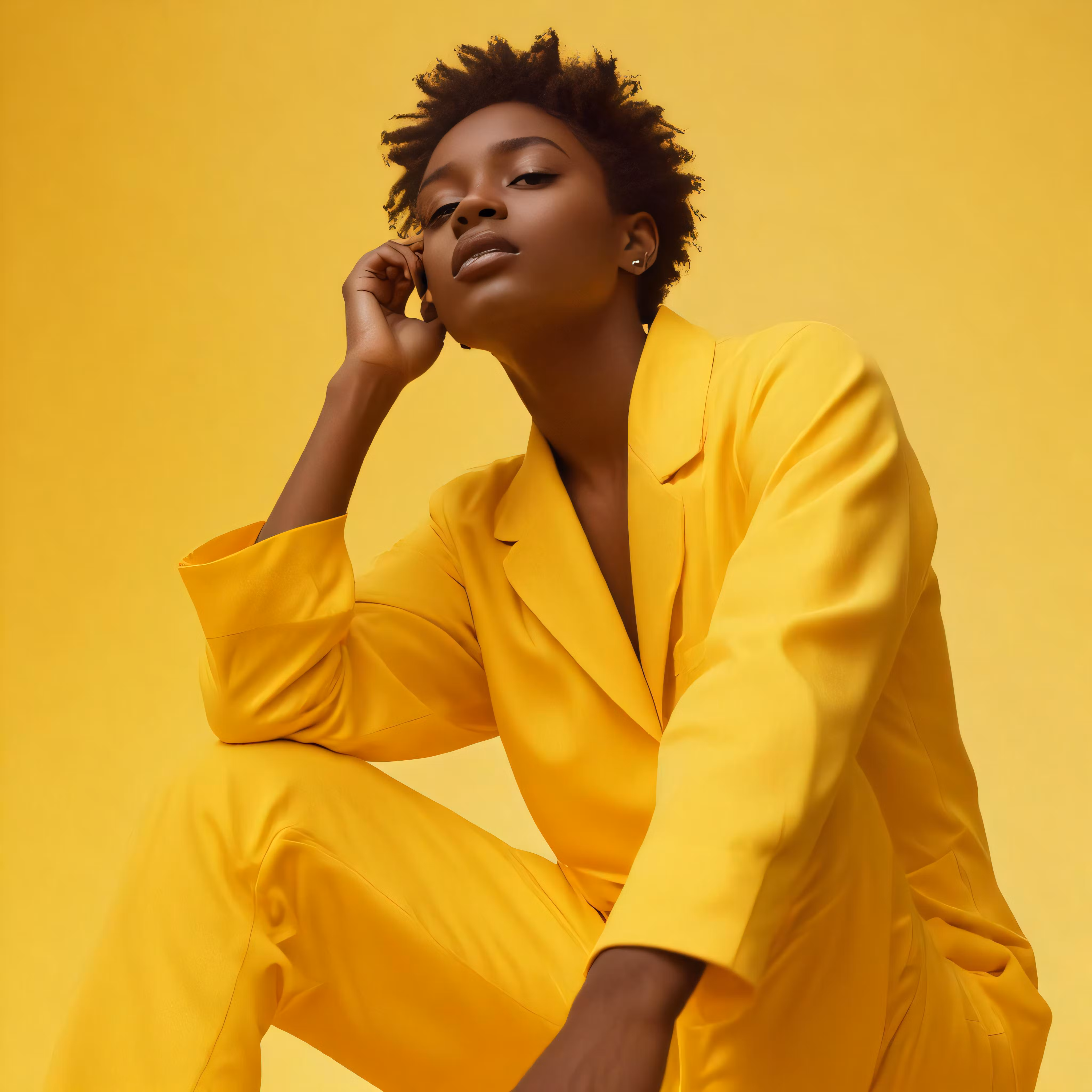 High resolution picture, free to use, a young person is posing for a photograph in a yellow suit