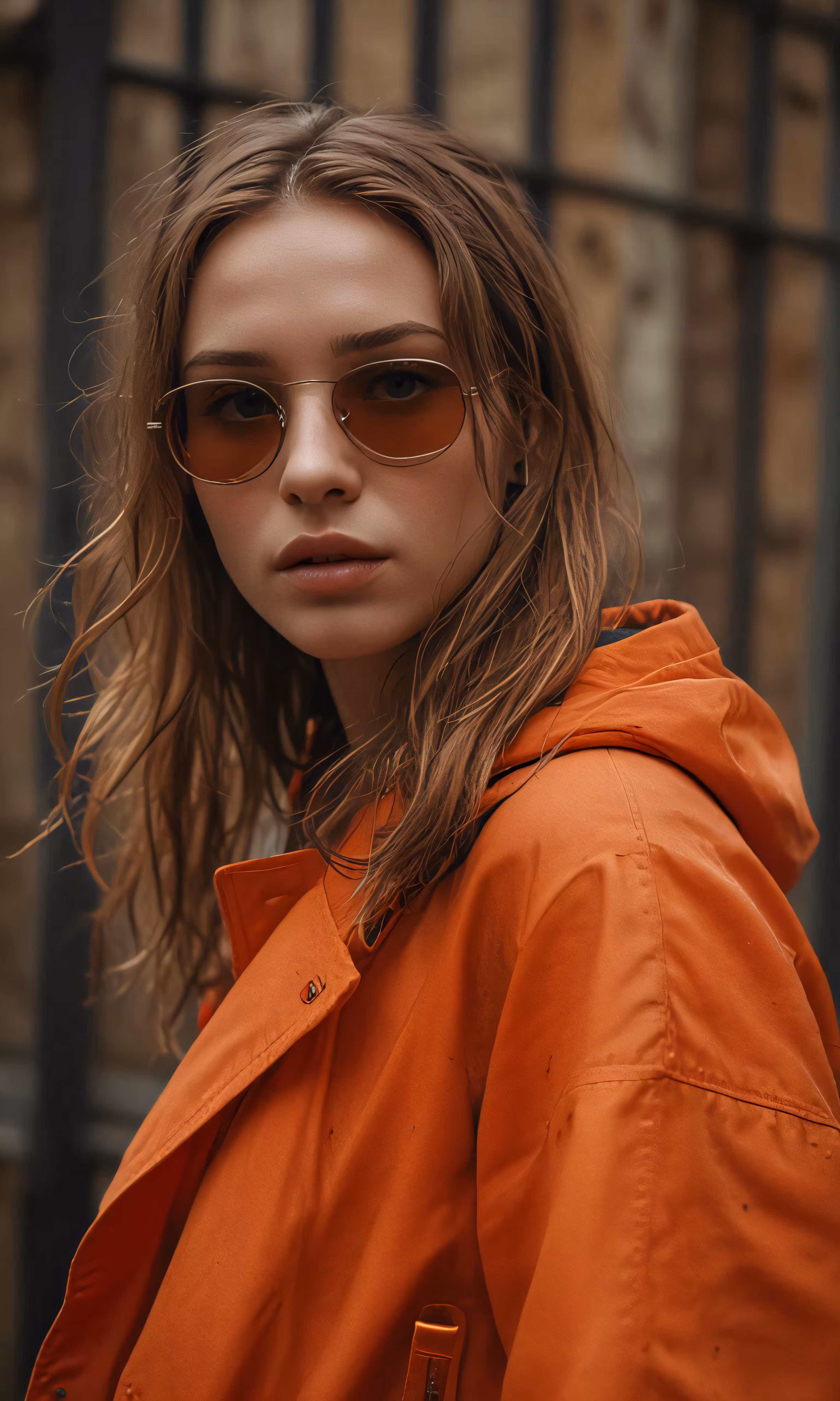 High resolution picture, free to use, a young woman in an orange jacket is wearing glasses