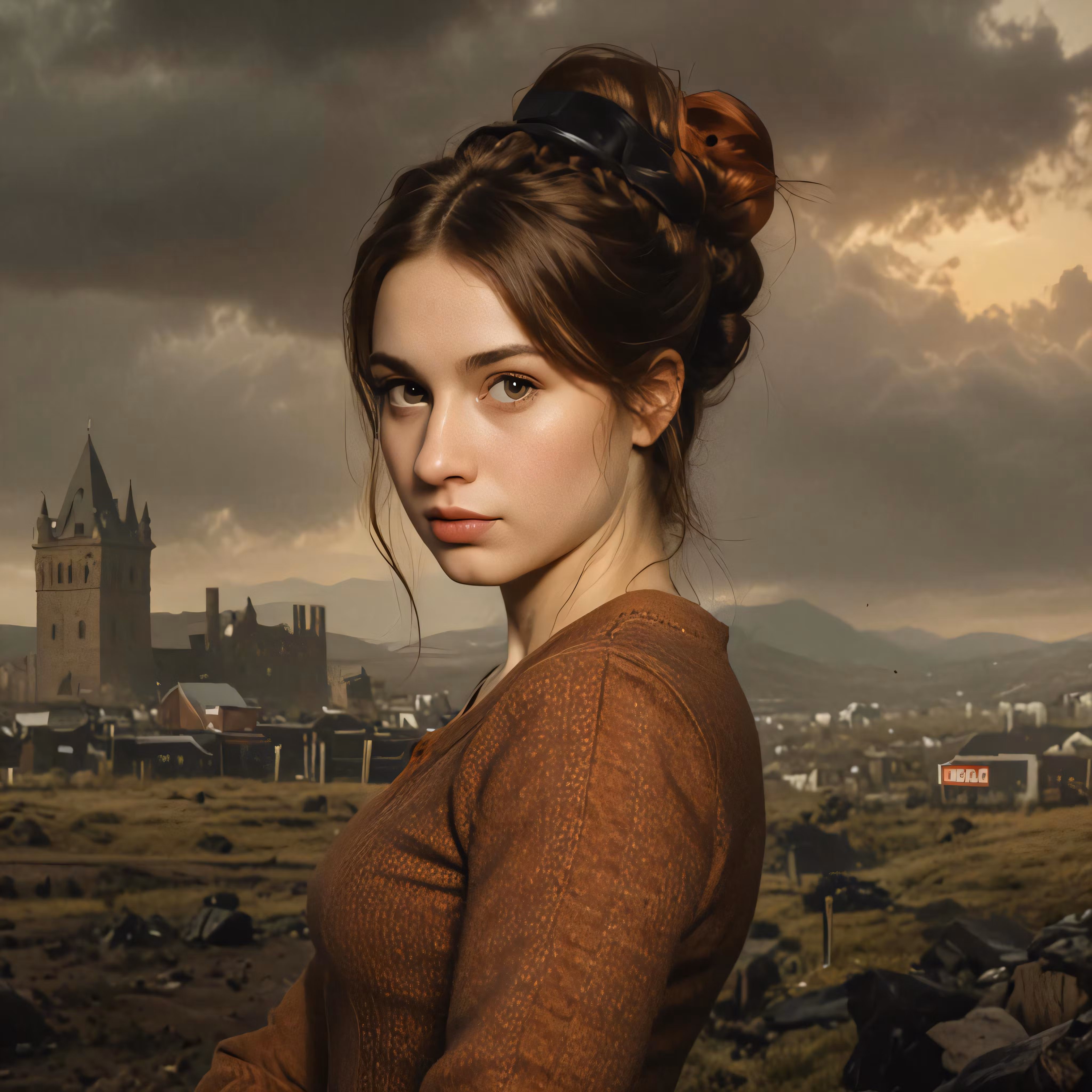 High resolution picture, free to use, a young woman in brown is standing by the grass