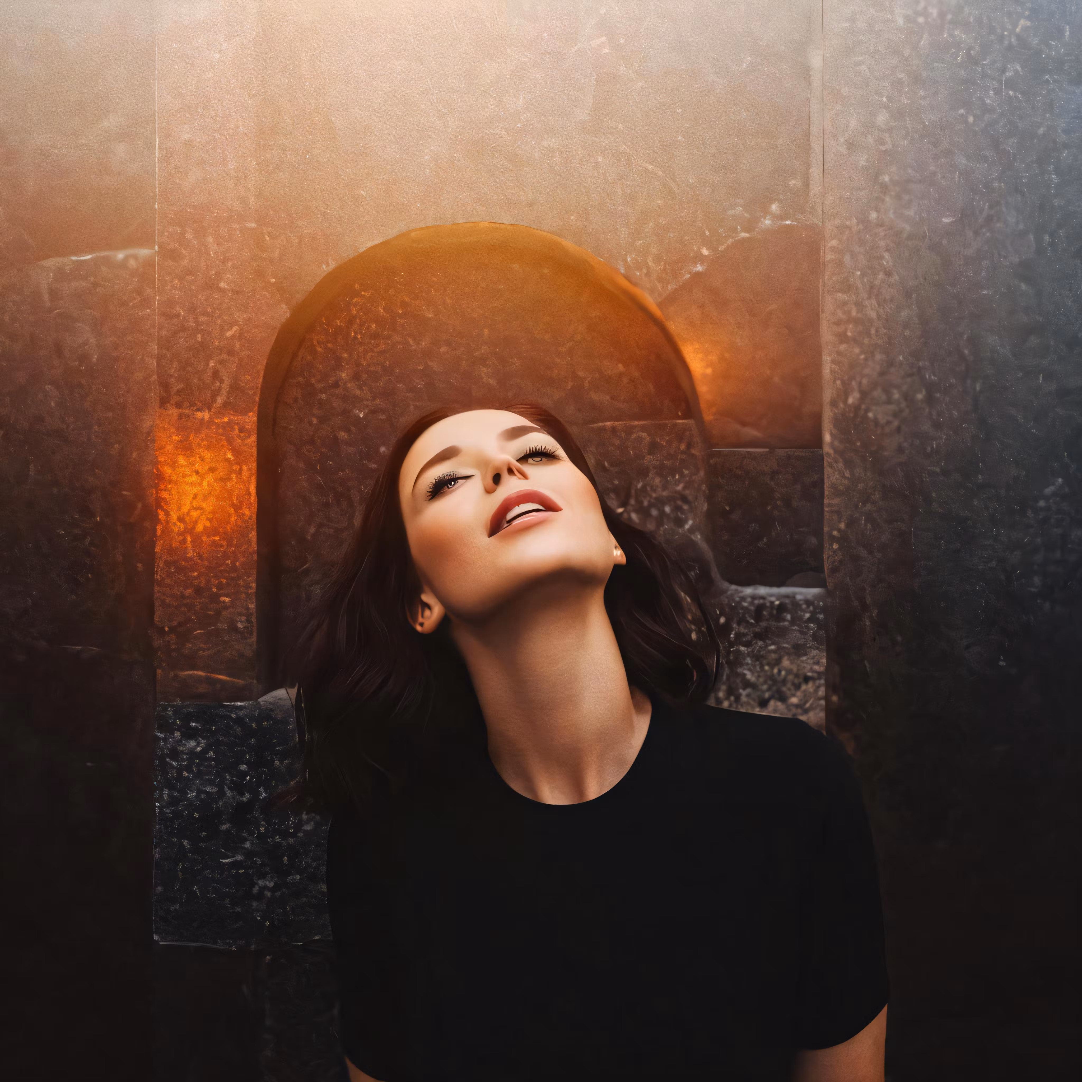 High resolution picture, free to use, a young woman is looking up at the sun coming out