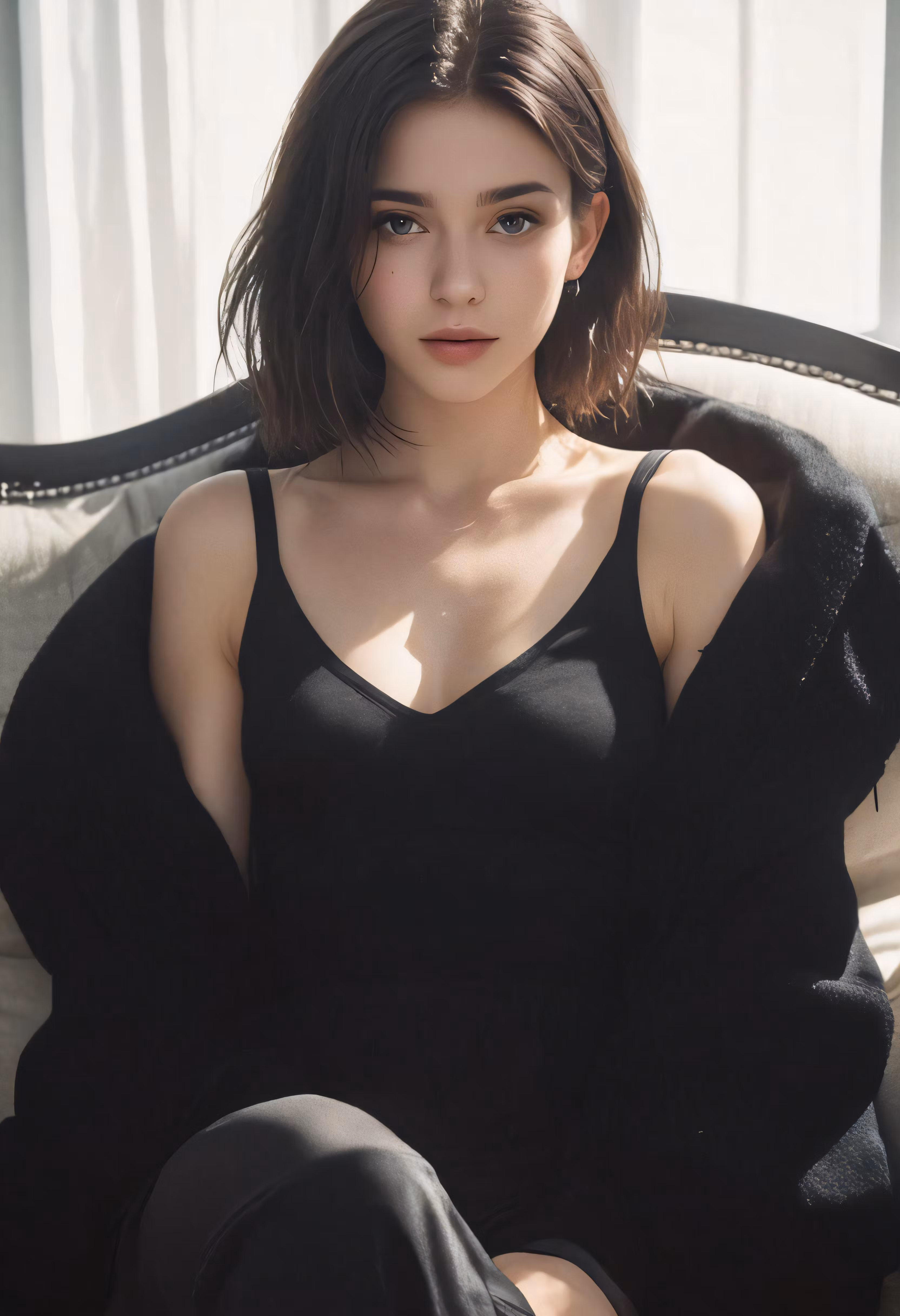 High resolution picture, free to use, a young woman is sitting on a couch wearing black