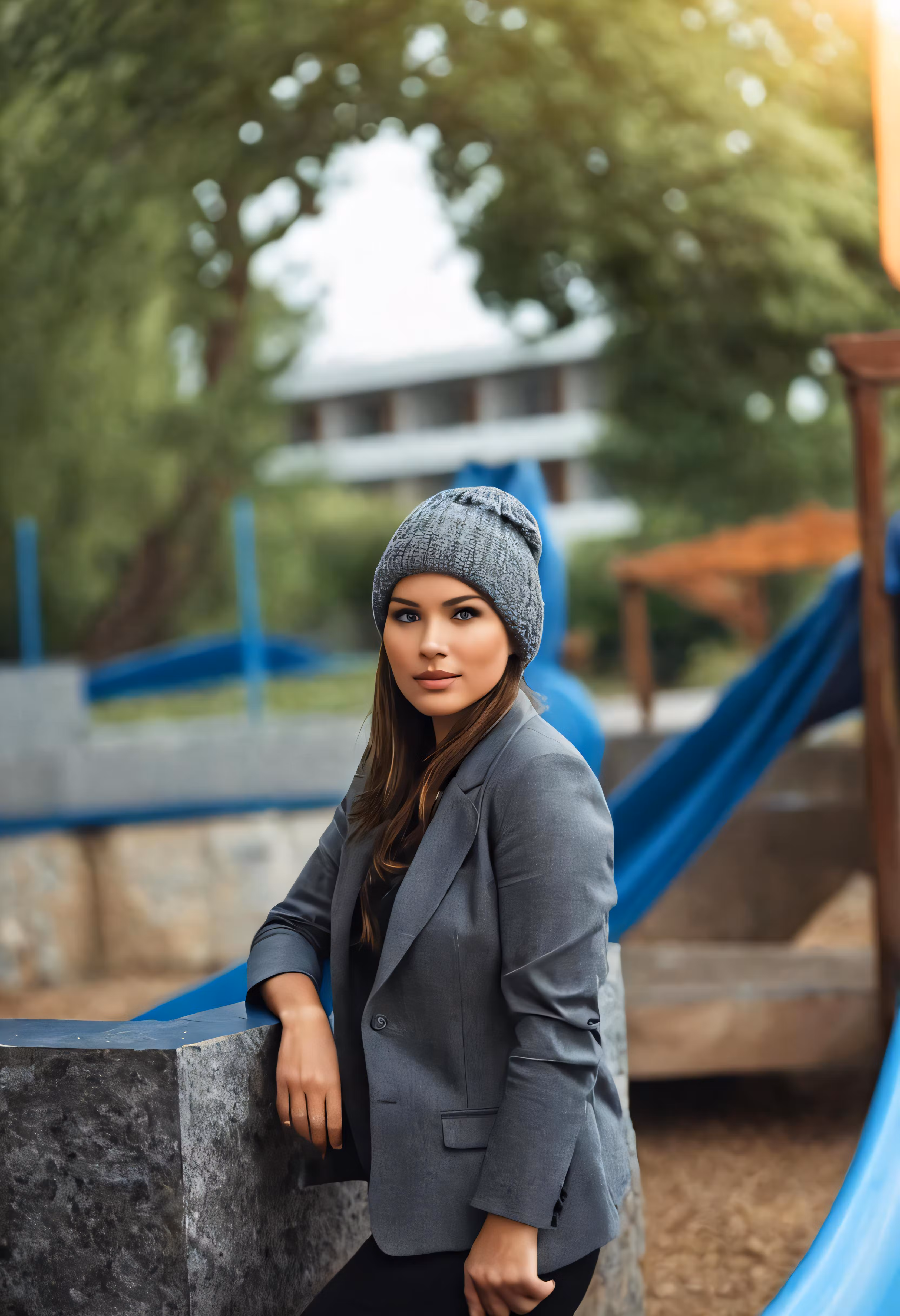 High resolution picture, free to use, a young woman posing on the edge of a playground