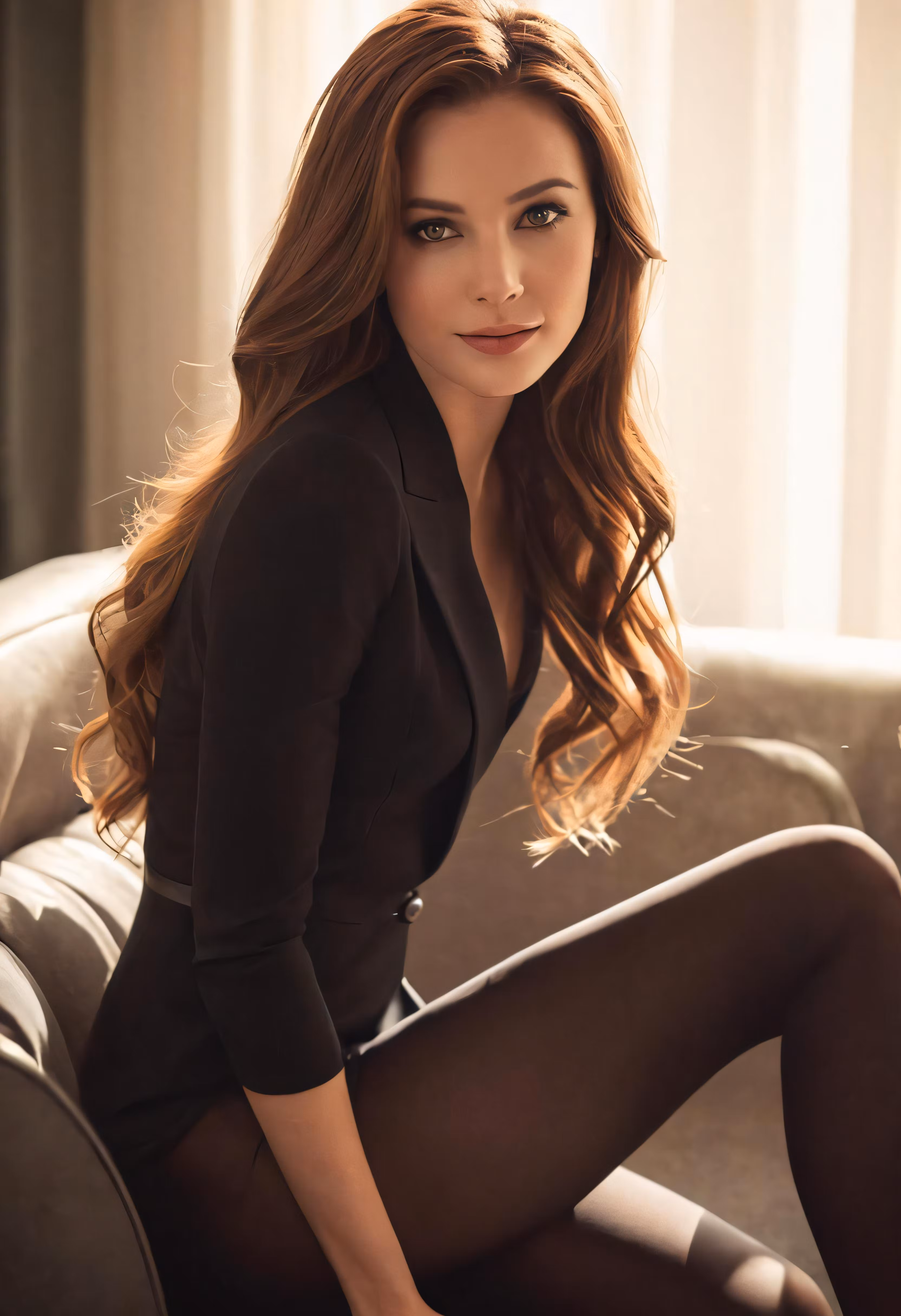 High resolution picture, free to use, a young woman sitting on a couch with her legs crossed