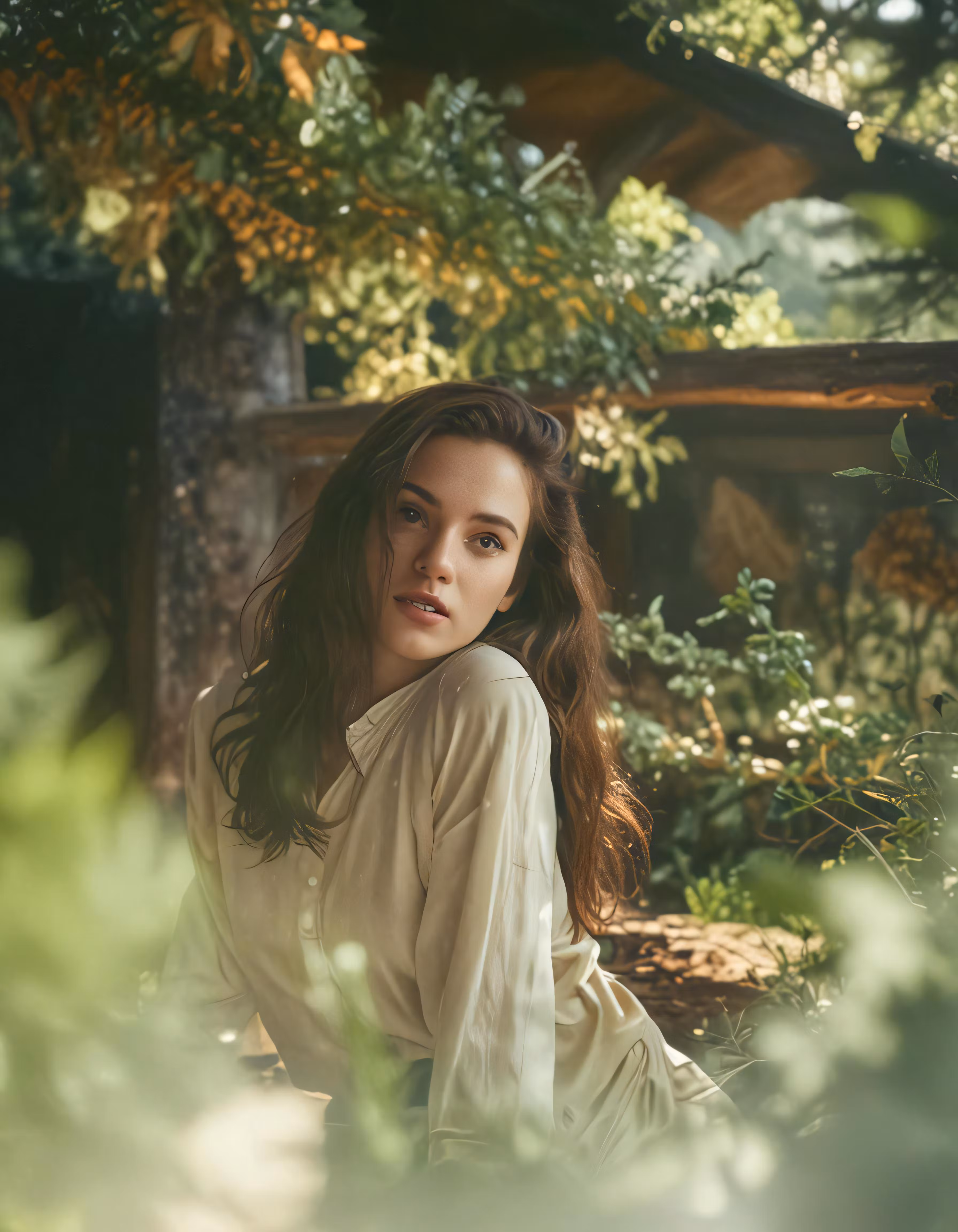 High resolution picture, free to use, a young woman wearing a brown blouse is posing outdoors