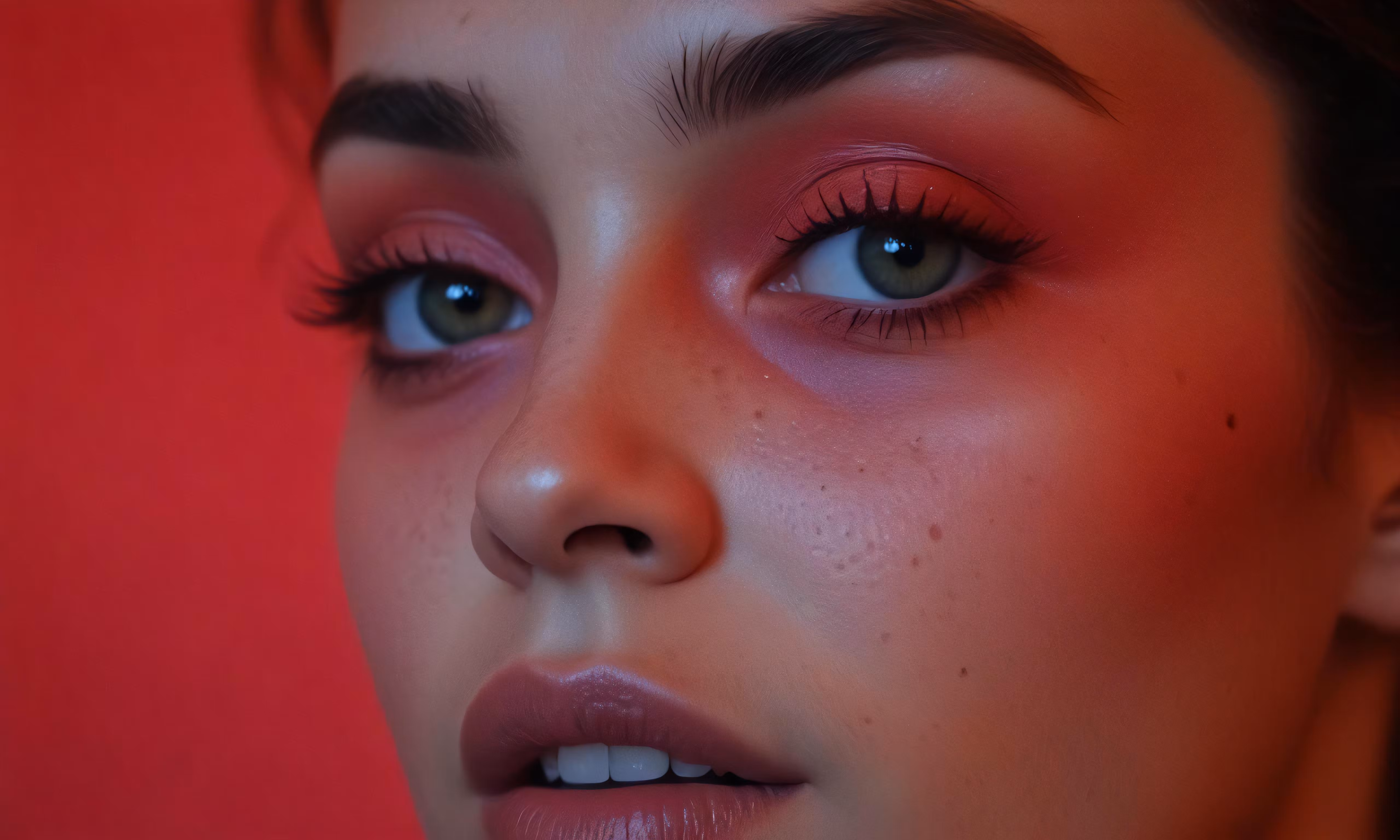 High resolution picture, free to use, a young woman with blue eyes and orange lipstick