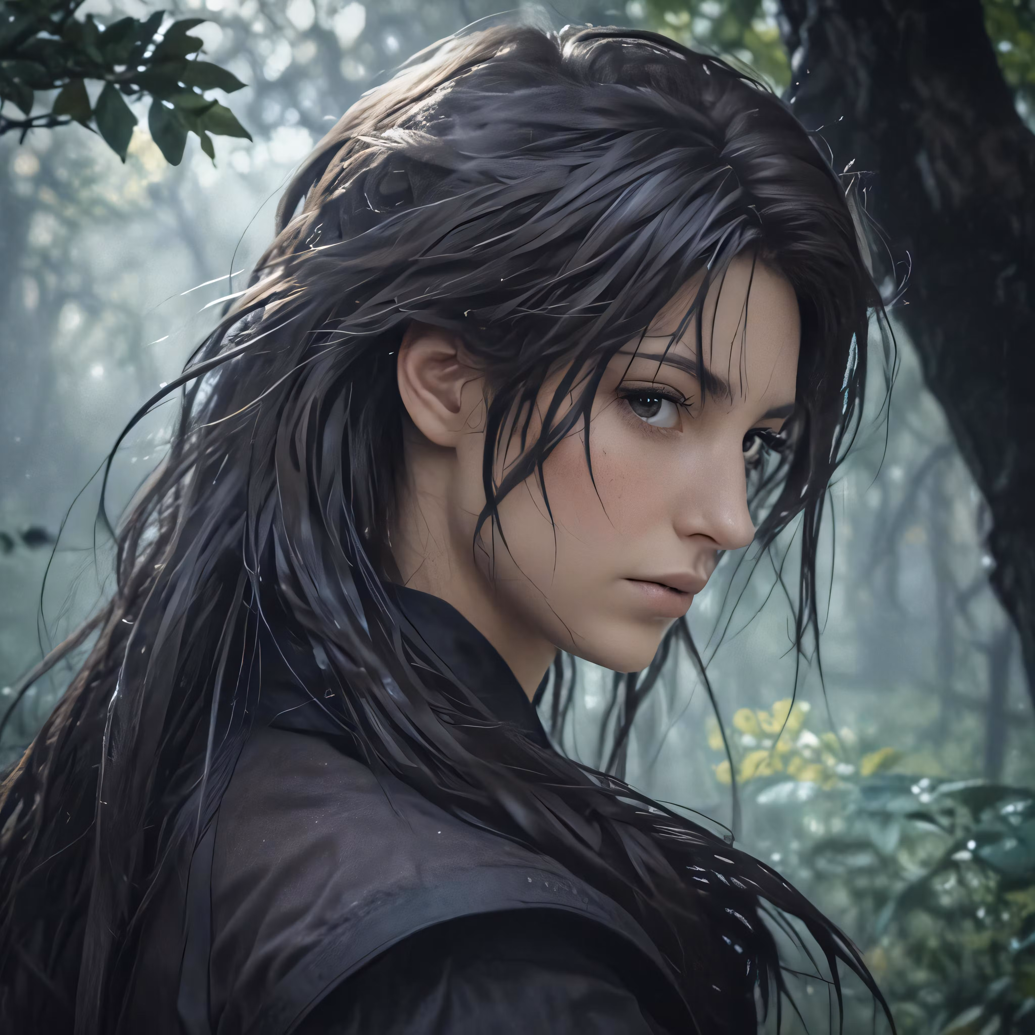 High resolution picture, free to use, a young woman with long dark hair looking into the distance