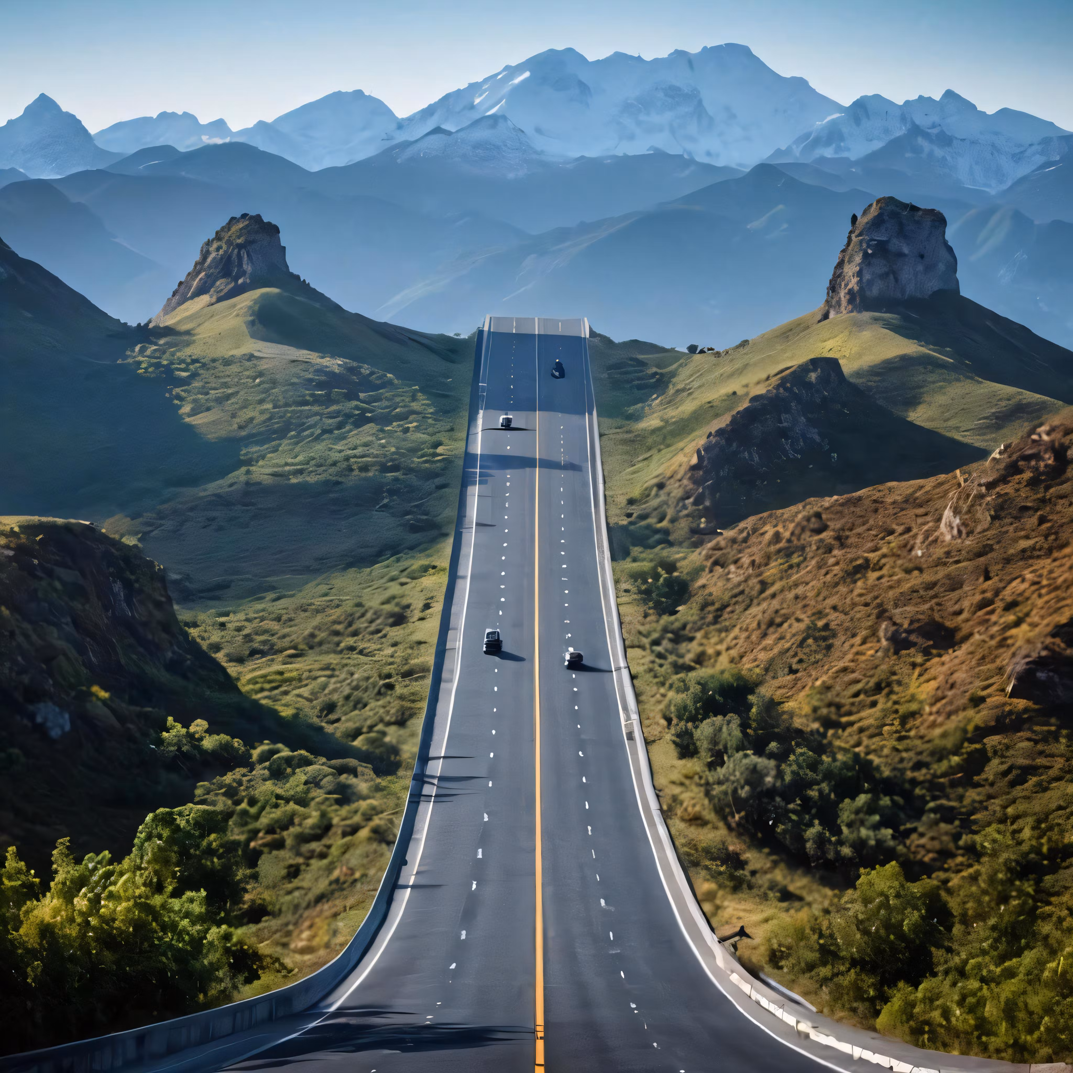 High resolution picture, free to use, aerial view of an empty highway surrounded by mountains
