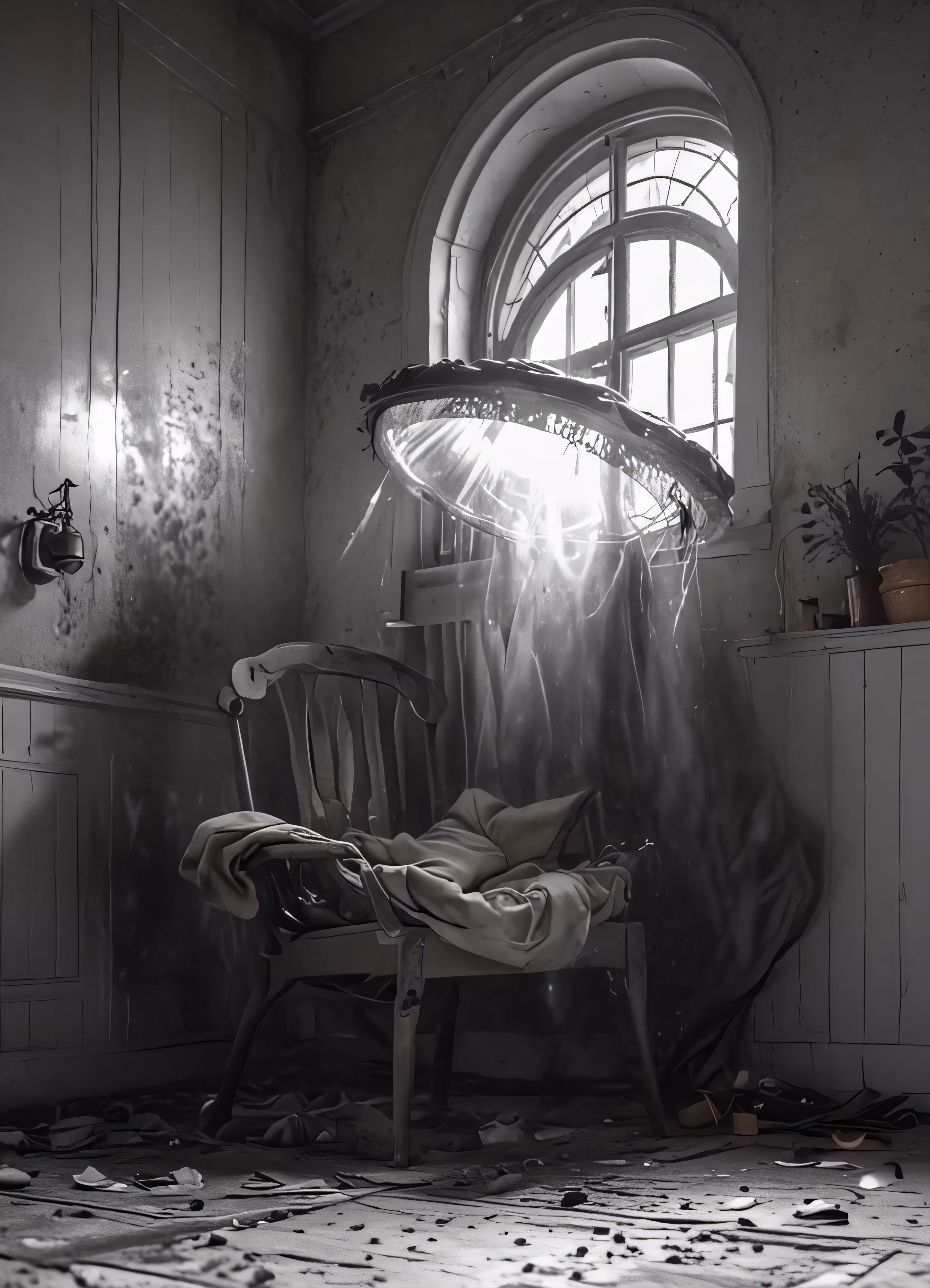 High resolution picture, free to use, an abandoned room with sun coming through the window and curtains
