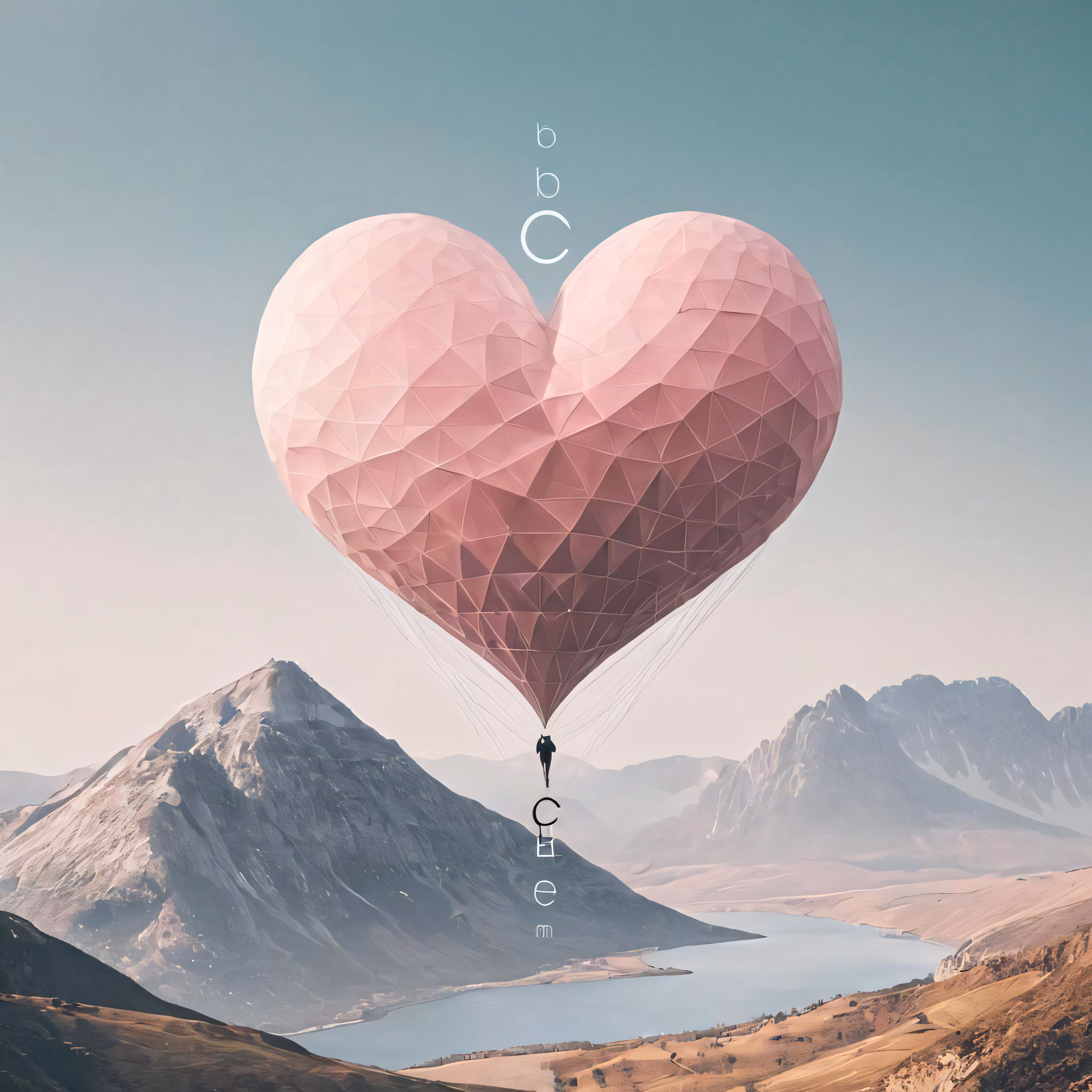 High resolution picture, free to use, an abstract heart   shaped balloon rises above mountains on a mountaintop