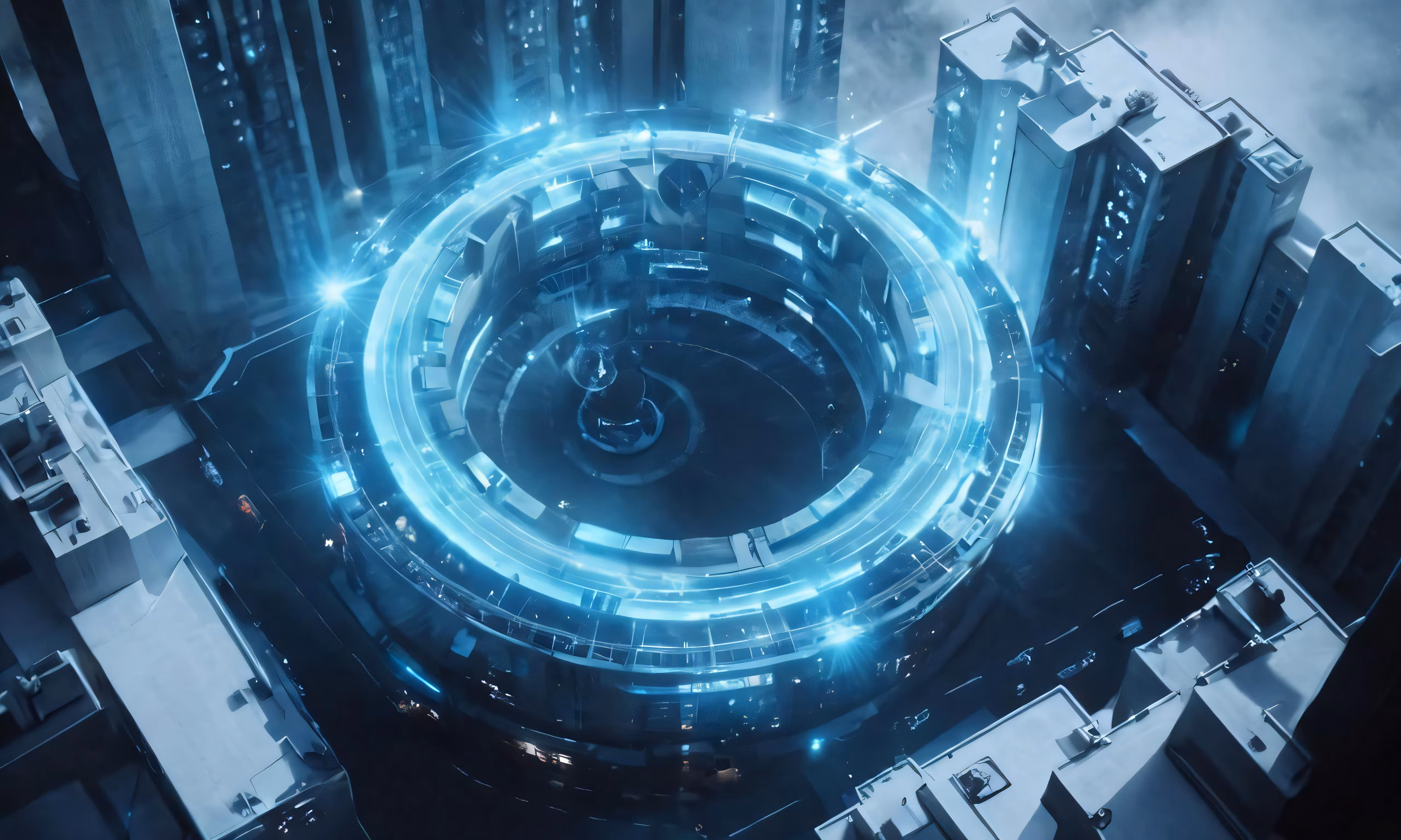 High resolution picture, free to use, an abstract image of a circular structure surrounded by tall buildings