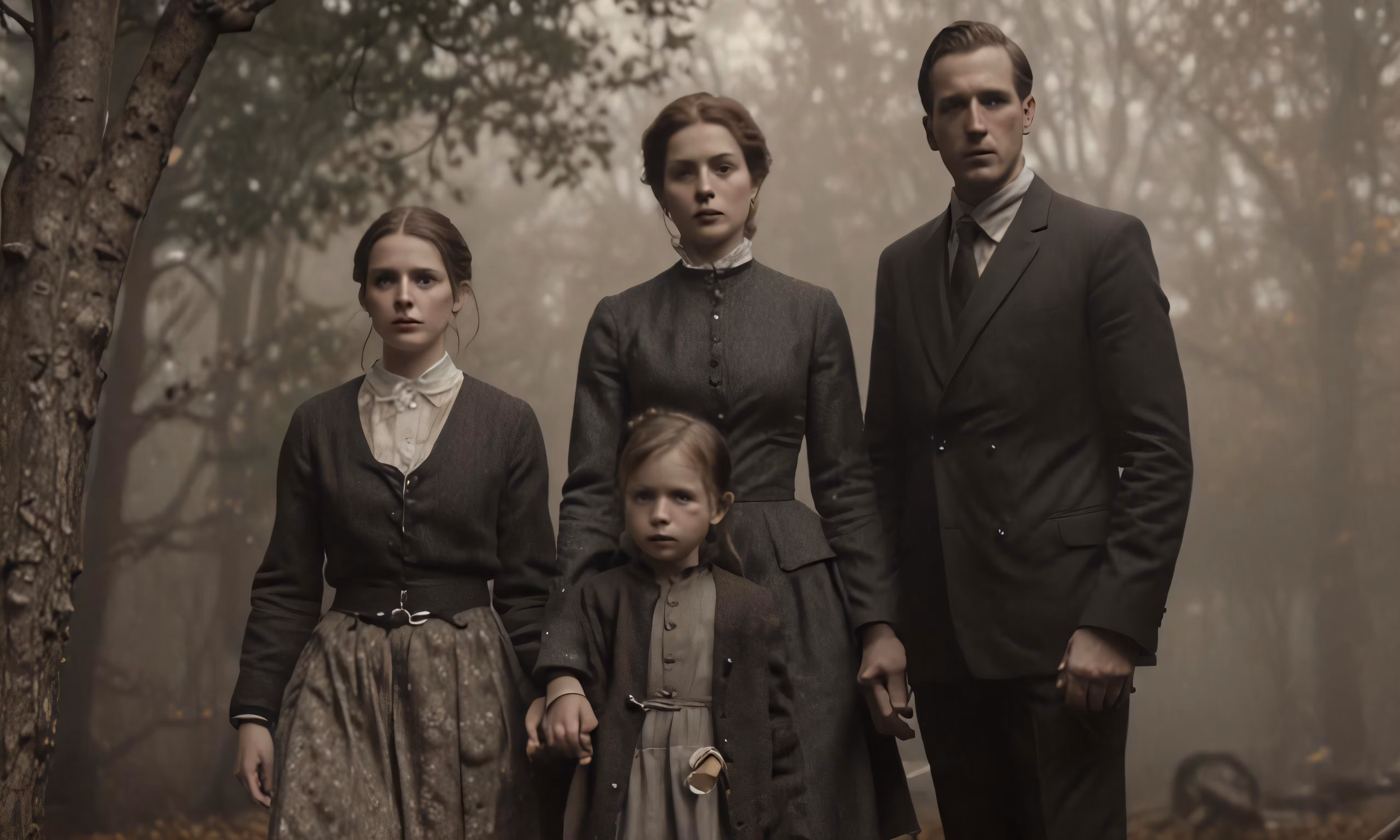 High resolution picture, free to use, an adult and two children stand beside a woman with an umbrella