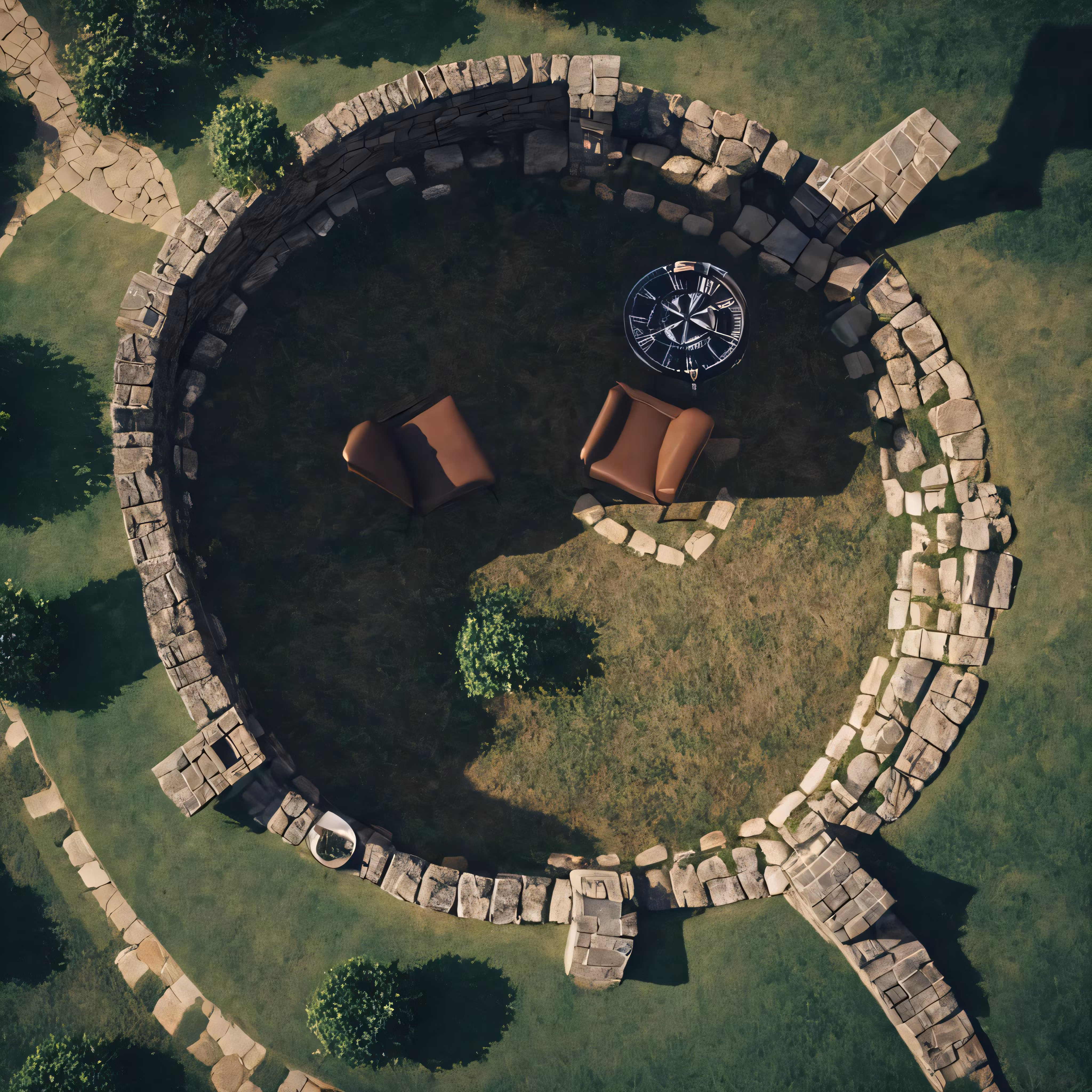 High resolution picture, free to use, an aerial view shows two chairs and an umbrella set out in the grass
