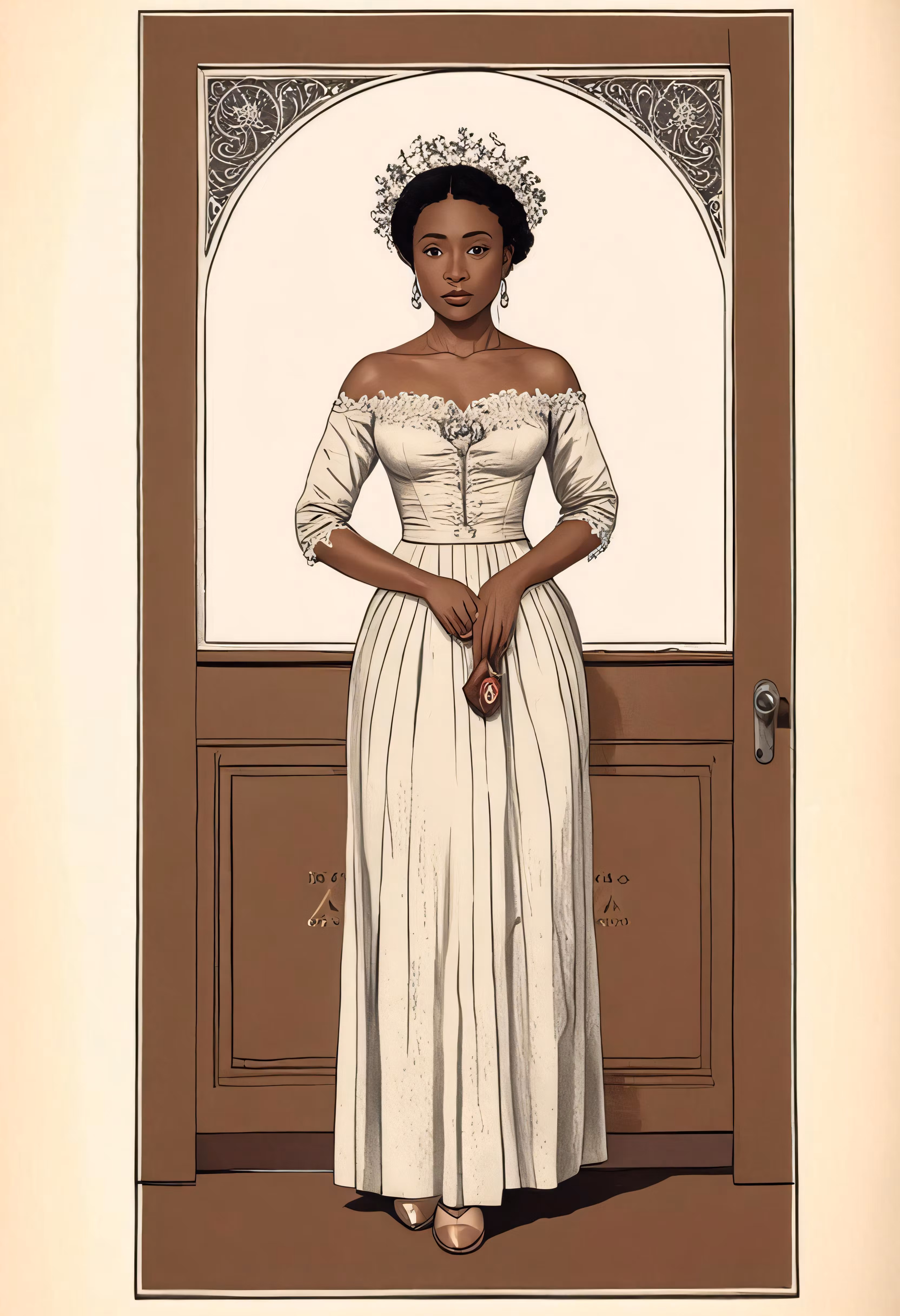 High resolution picture, free to use, an african woman in a white dress stands by a door