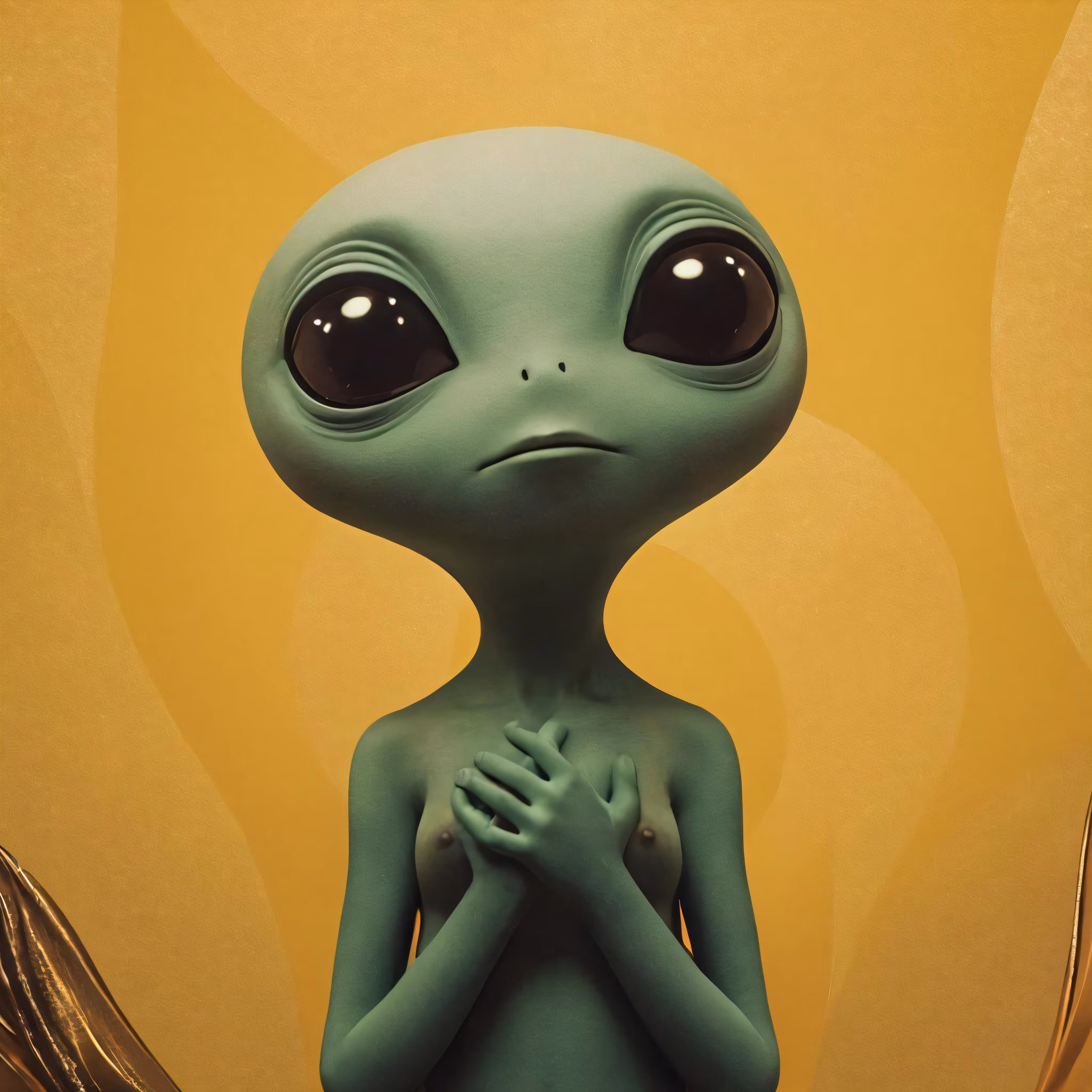 High resolution picture, free to use, an alien like statue with eyes standing against a wall