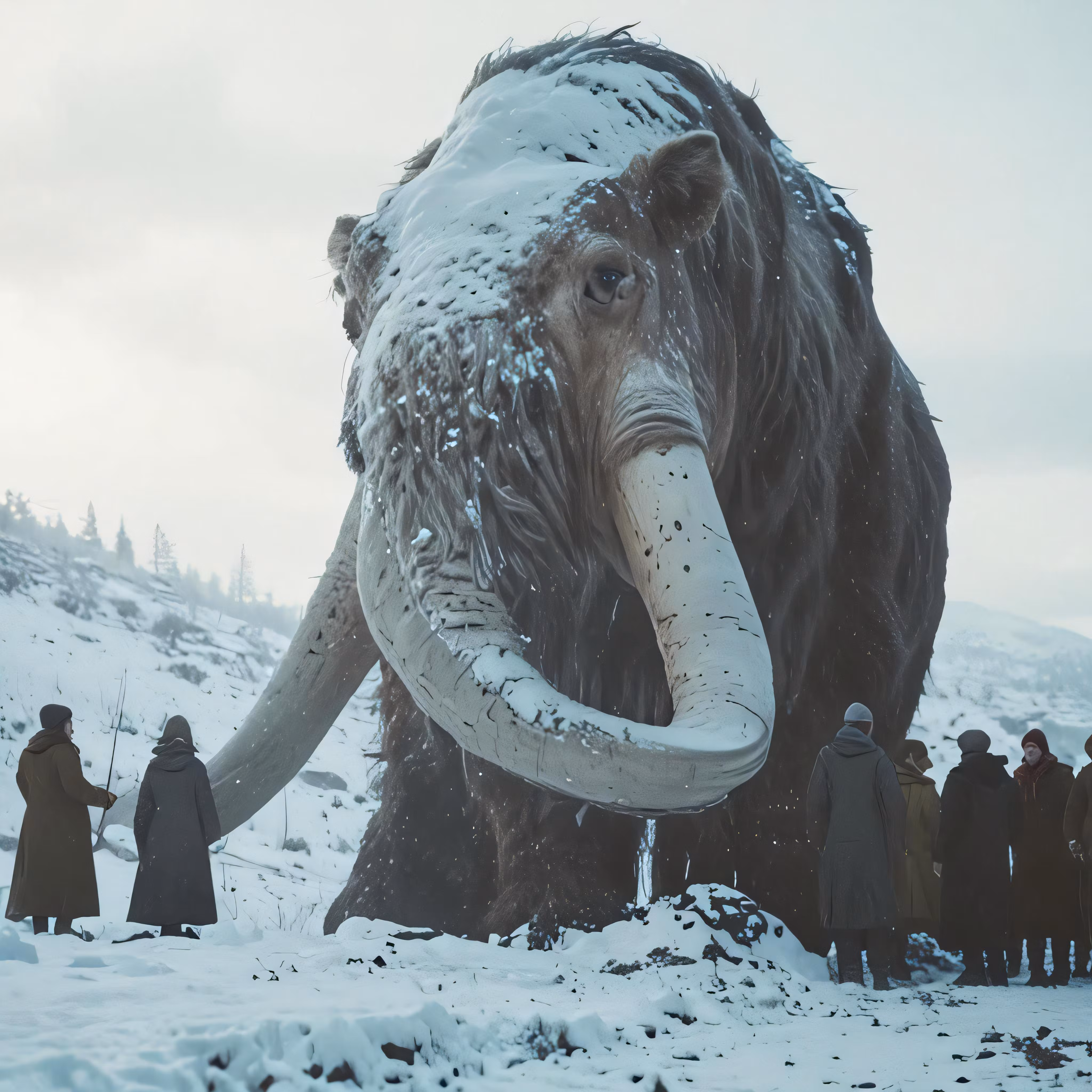 High resolution picture, free to use, an animal standing in the snow with people near by