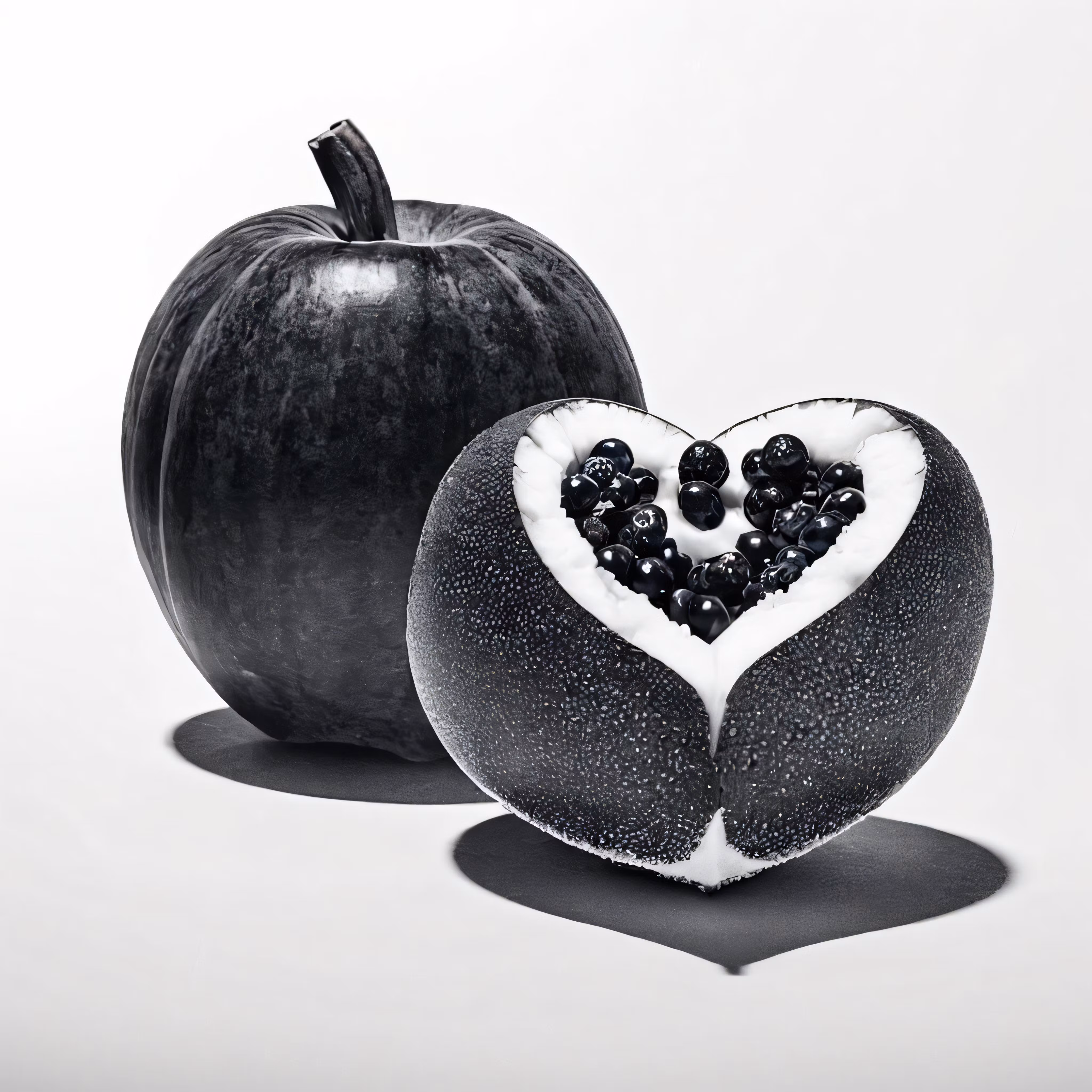 High resolution picture, free to use, an apple, an apple core and two berries in the middle