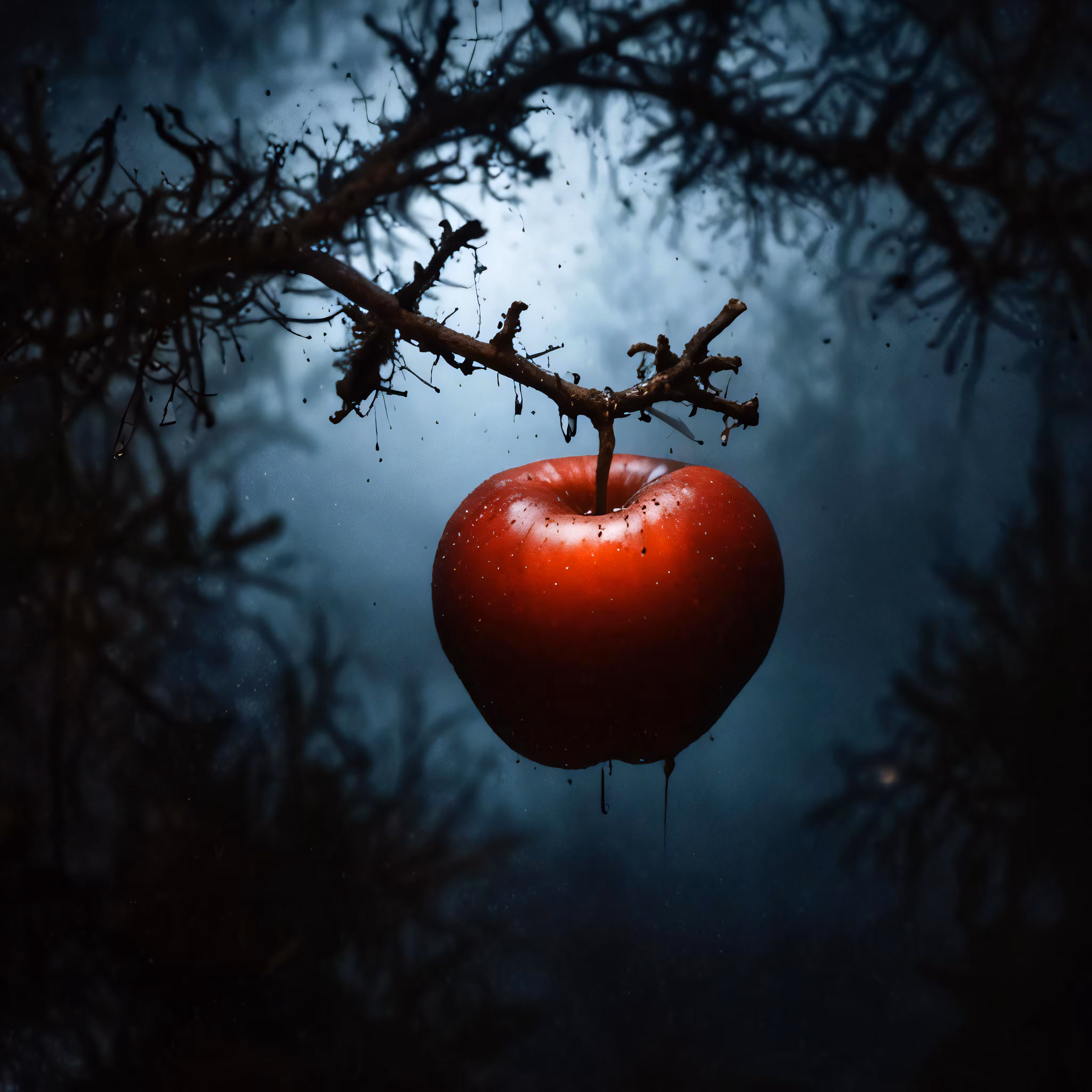 High resolution picture, free to use, an apple hanging from the limb of a pine tree