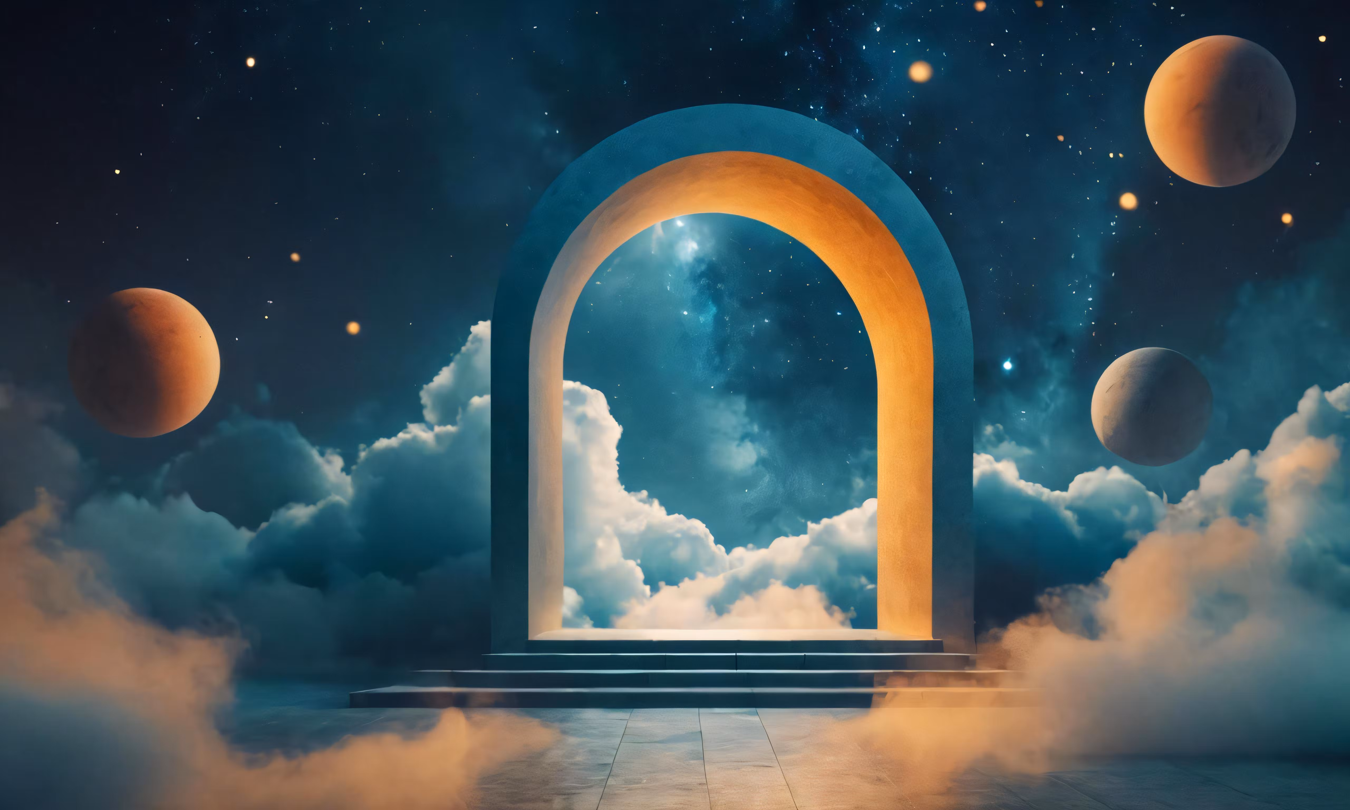 High resolution picture, free to use, an arch to the stars above clouds and saturn