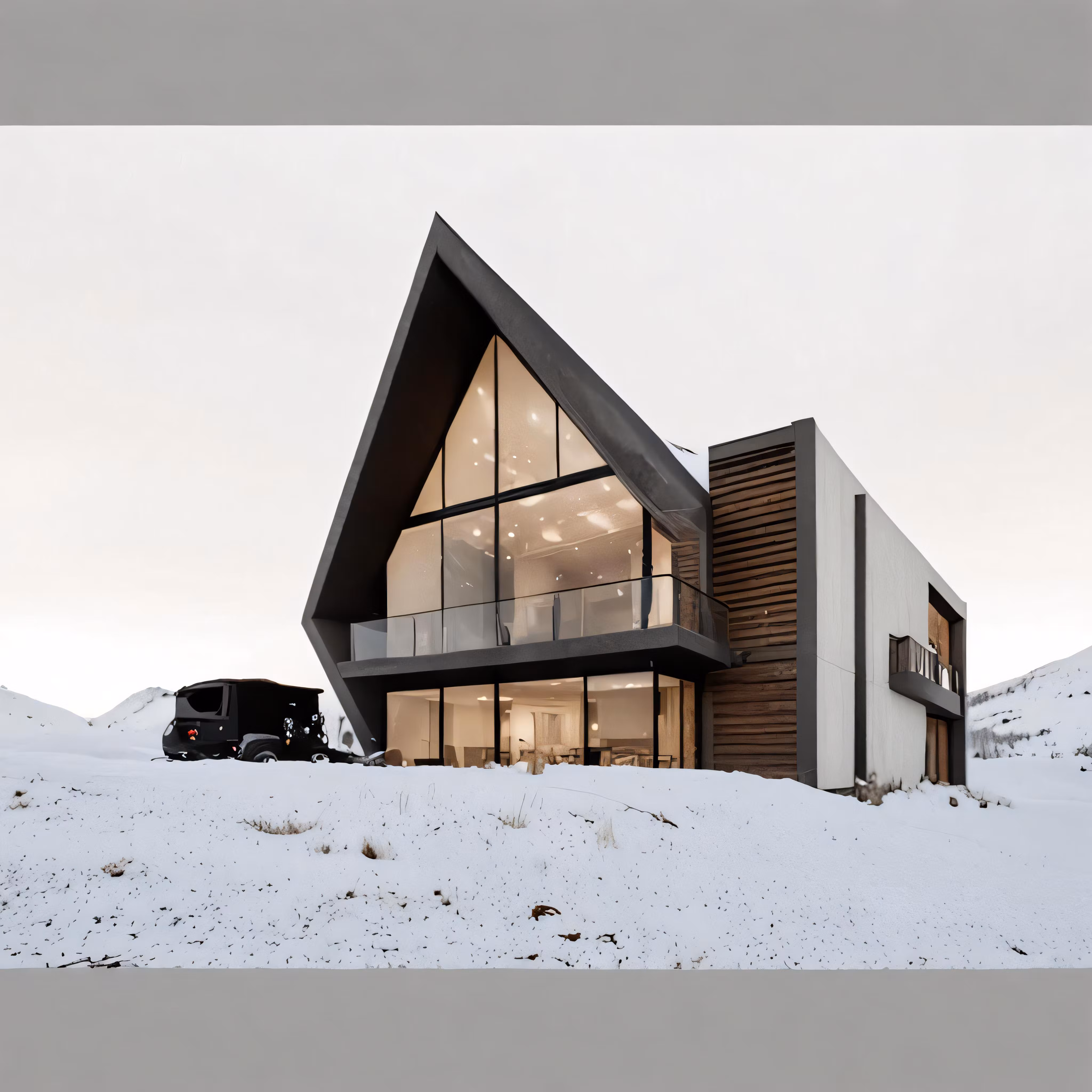 High resolution picture, free to use, an architecturally designed house is on the slopes near a mountain