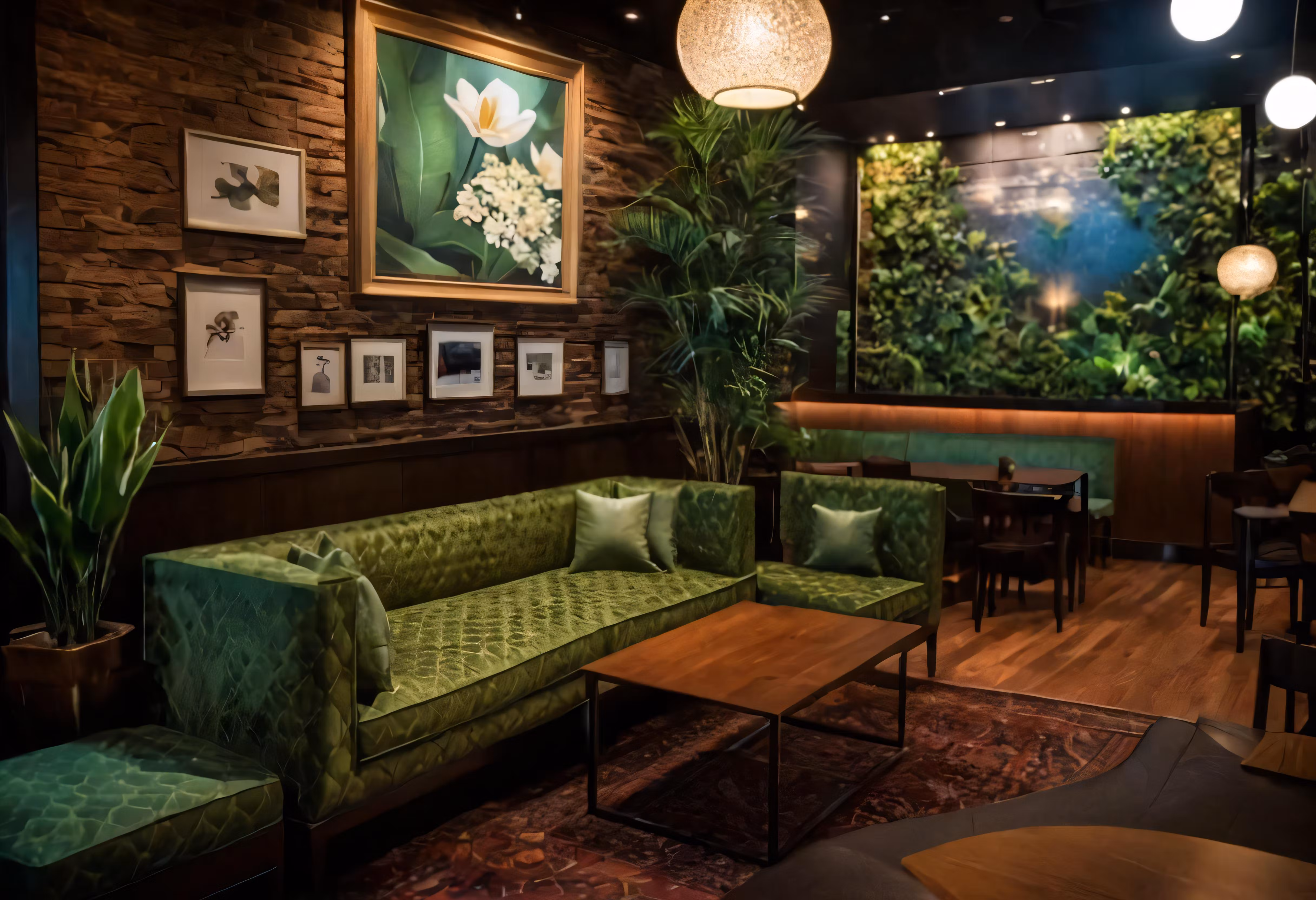 High resolution picture, free to use, an area with green couches, coffee tables, and large paintings