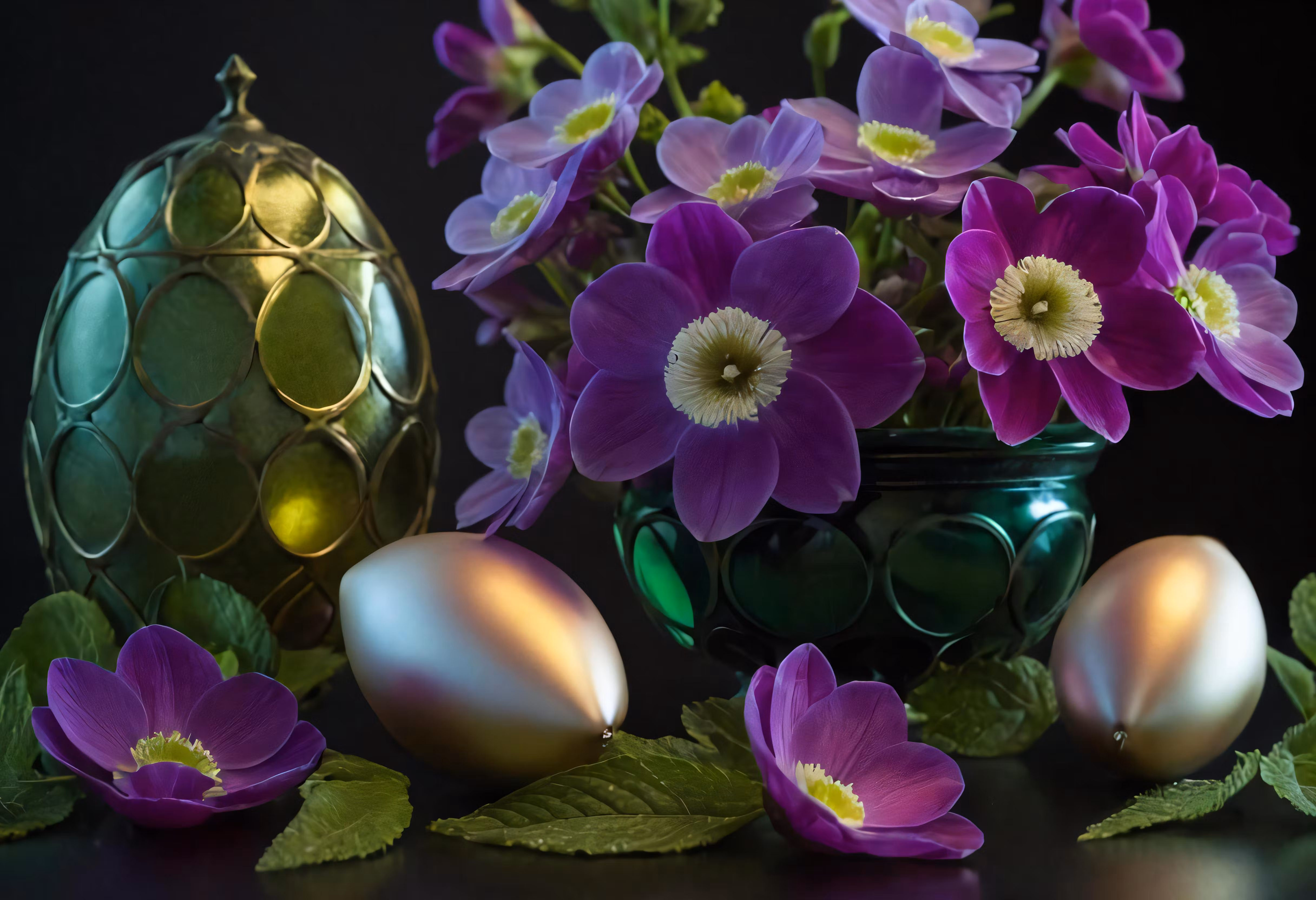 High resolution picture, free to use, an arrangement of flowers with three eggs surrounded by it