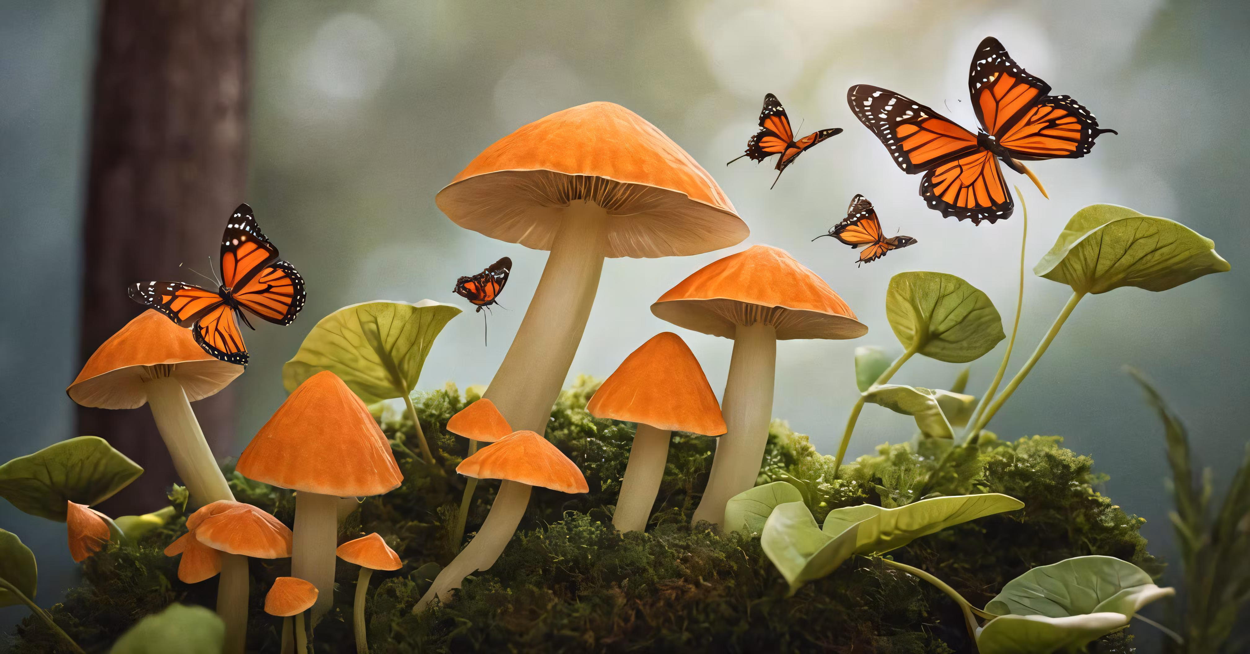 High resolution picture, free to use, an array of small butterflies fly above a group of orange mushrooms